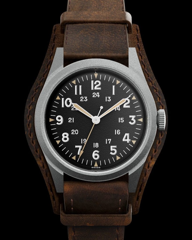 C’est au cœur de l’Histoire, celle des champs de bataille, que BENRUS forge sa légende. Pendant la guerre du Vietnam, la marque équipe les soldats américains avec la DTU-2A/P, sélectionnée par le Département de la Défense pour répondre aux normes strictes MIL-W-3818B. Lisibilité, robustesse, précision : tout est pensé pour la mission. Le mouvement suisse est modifié pour intégrer la fonction hacking, indispensable à la synchronisation des opérations.