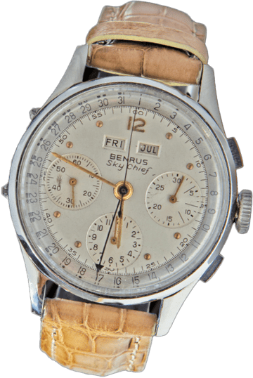 Mais BENRUS n’est pas seulement un témoin de mode. Elle accompagne aussi les grandes révolutions techniques et sociales. En 1940, le chronographe Sky Chief devient l’allié des pilotes de ligne. Il adopte une graduation spécifique, avec des intervalles de quatre minutes, pensée pour la navigation aérienne. Une véritable montre outil, conçue pour l’action, qui séduit les compagnies aériennes et reste aujourd’hui un objet de collection très recherché.