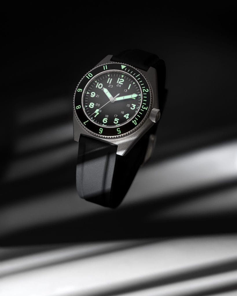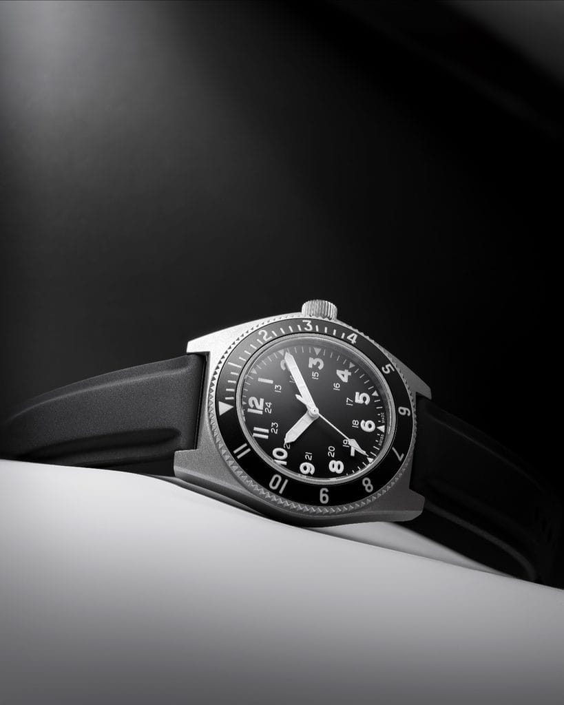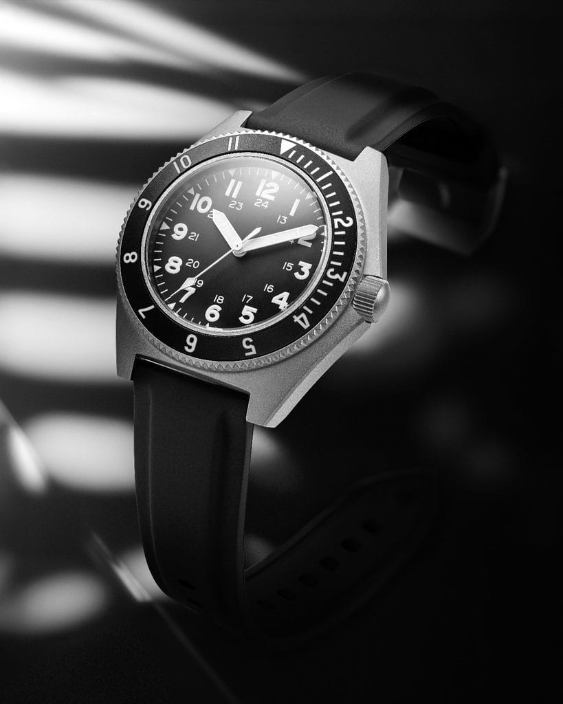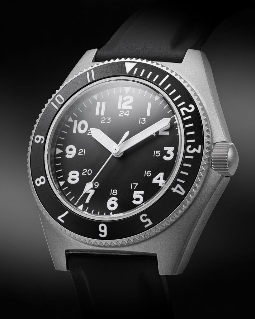 Sous la surface, son étanchéité de 36,5 ATM (365 m / 1200 pieds) dépasse largement les exigences militaires de l’époque. Une couronne vissée, une lunette bidirectionnelle avec insert en aluminium et un fond gravé MIL SPEC parachèvent un ensemble prêt à affronter les conditions extrêmes, du désert aux abysses.