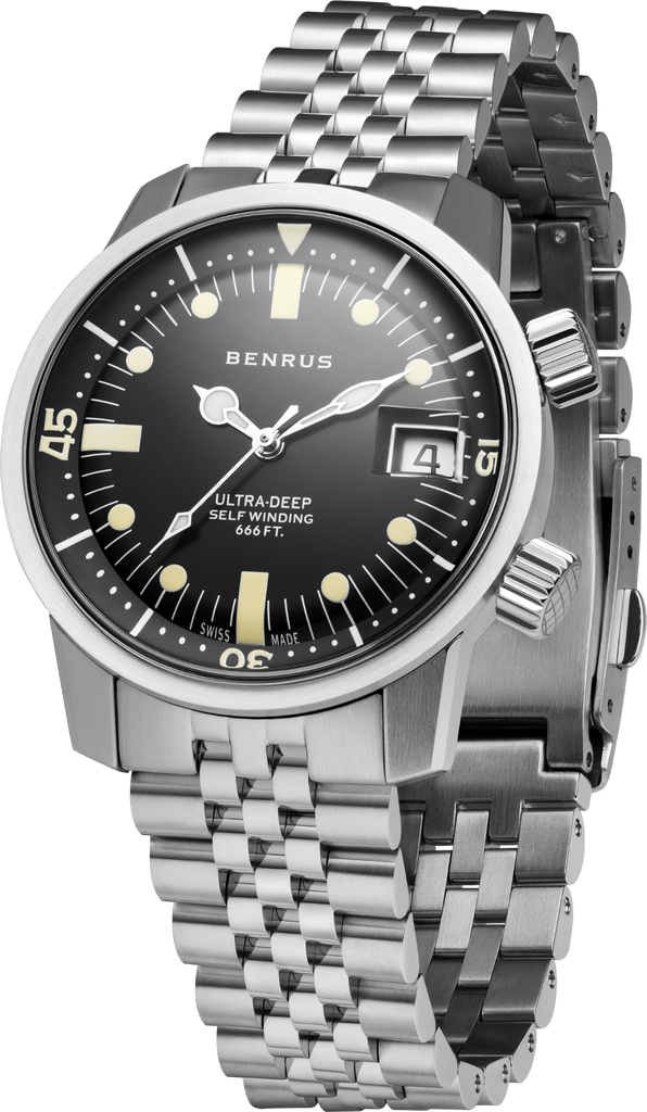 Parce qu’elle a été conçue pour accompagner les aventuriers aussi bien sous l’eau qu’à la surface, la Benrus Ultra-Deep se dote d’une polyvalence rare.