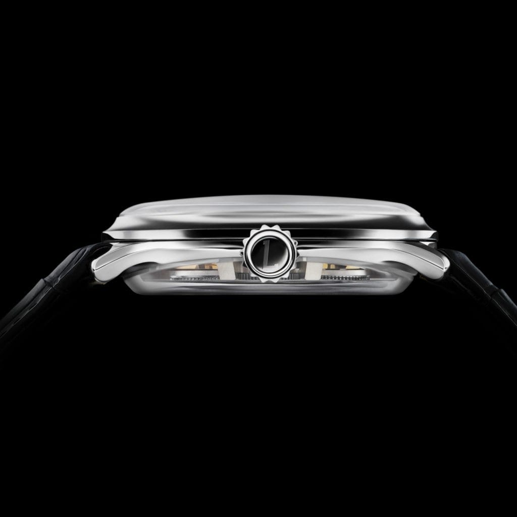 Le Central Impulse Chronometer est également proposé dans une seconde version à la boîte en or gris, dont le cadran noir soleillé est largement ouvert. Cette grande fenêtre libère la vue sur le calibre 9012 et ses organes les plus distinctifs que sont les remontoirs et l’échappement. Cette montre représente le pendant technique, plus complexe, de la version en or rose, plus épurée et dont l’extrême sophistication est entièrement insoupçonnable, à moins de retourner la pièce. Là, un fond en verre saphir révèle l’architecture du calibre 9012, symétrique, oblique, largement ajouré et très grand puisqu’il mesure 39,3 mm de diamètre. Les ponts de remontoir, de rouage, de remontoir d’échappement et de balancier sont tous squelettés et présentent des formes géométriques élancées, qui contrastent radicalement avec le dépouillement de la « Tribute to the Masters Of Escapements » Central Impulse Chronometer en or rose.