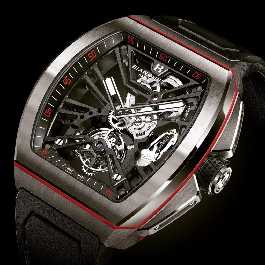 Il existe une terre inconnue en horlogerie, celle où se positionne Bianchet Genève : un garde-temps moderne, sportif, conçu pour la performance, au juste prix, sur le segment de la véritable Haute Horlogerie Swiss Made. Ces différentes propositions ont façonné la G5000 Active Tourbillon. Son seul patronyme résume presque toute son identité. Il s’agit d’une pièce de Haute Horlogerie (« Tourbillon »), destinée à une clientèle orientée sport et performance (« Active ») pouvant porter sa pièce en presque n’importe quelle condition grâce à une exceptionnelle robustesse aux « g » pour « gravité », mesurant une accélération perçue comme un poids par un corps (« G5000 »).