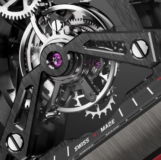- Mouvement mécanique BAT 01, tourbillon squelette à remontage manuel. Profils d’engrenages conçus pour réduire les variations de couple à chaque passage de dent