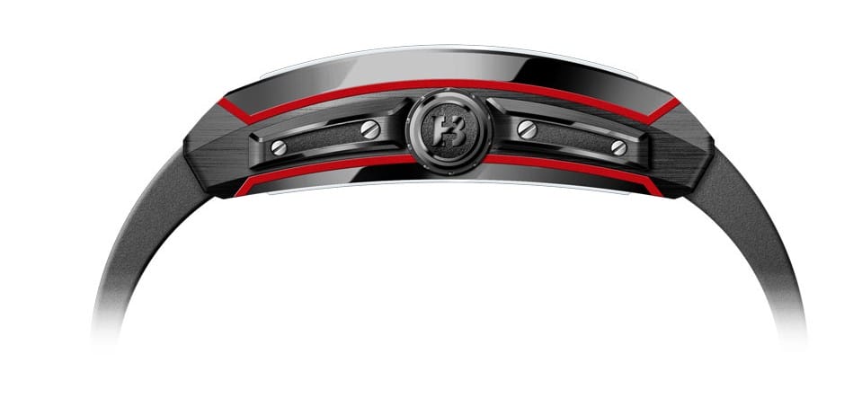 D’un point de vue esthétique, la forme tonneau est également l’une des géométries les plus anciennes de la montre bracelet. Particulièrement exploitée durant la première moitié du XXe siècle, le plus souvent dans des pièces féminines, elle est un compromis parfait entre le rond et le carré, prenant la douceur des courbes du premier et la puissance des angles du second, soulignées par un insert de couleur en fibre de verre, accentuant son caractère sportif.