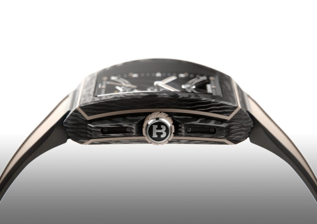 Le boîtier de forme tonneau en carbone mesure 43 mm de largeur, 50 mm de hauteur (longueur) et 13 mm d’épaisseur. Et pas n’importe quel carbone : dans ce composite avancé, léger et incroyablement résistant, de la poudre de titane a été ajoutée aux fibres de carbone lors du processus de fabrication du matériau. Le résultat est un effet moiré qui alterne entre le brillant et le mat dans un motif aléatoire unique à chaque pièce.