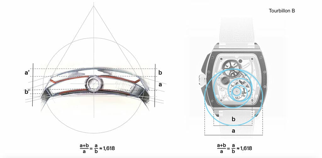 Architecture du mouvement, design de la boite, toutes ses proportions ont été pensées et dessinées selon les principes définis par le Nombre d’Or 1.618