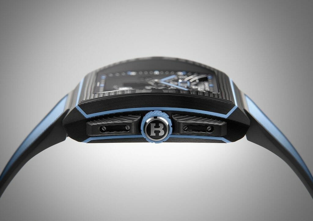 Une des rares montres en carbone de forme tonneau capables de résister à une pression de 10 ATM (équivalente à 100 mètres de profondeur) et à des chocs de 5000G, la montre Tourbillon Volant Grande Date B1.618 a été conçue pour être polyvalente, pouvant être portée durant les activités sportives et aquatiques.