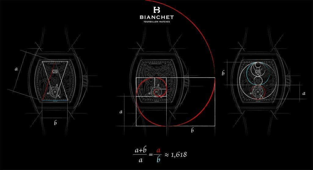 En appliquant des principes de conception millénaires dérivés de l’emblématique section dorée 1,618, aussi appelée “divine proportion” et utilisée depuis des siècles dans les compositions les plus harmonieuses de l’art, de l’architecture et de la musique, Bianchet insuffle des proportions parfaites à ses garde-temps ultramodernes.
