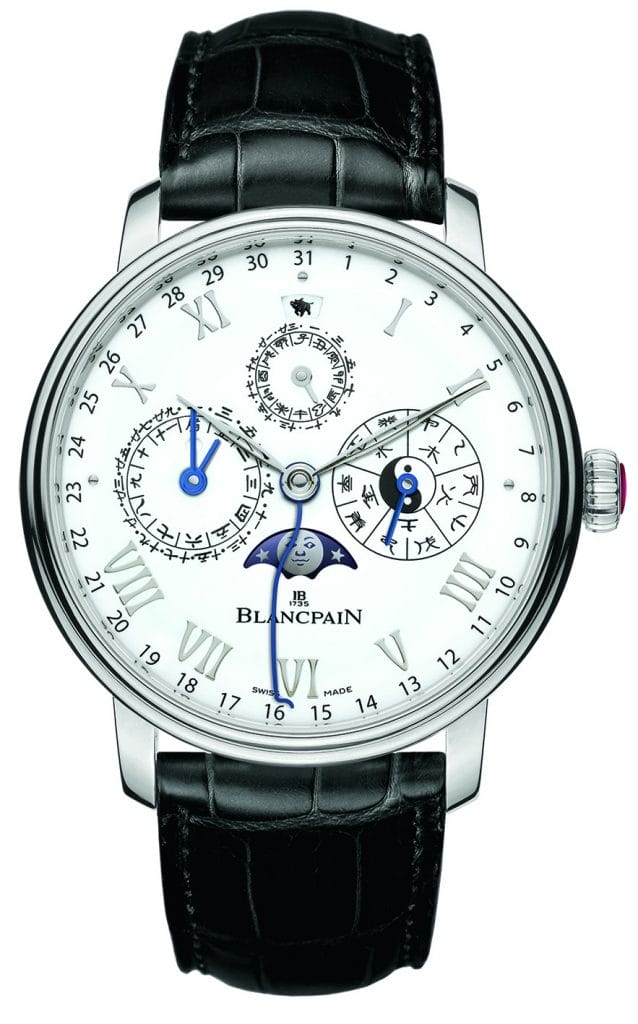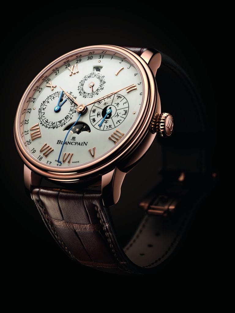 Avec le Calendrier Chinois Traditionnel, Blancpain a relevé le défi de réunir mécaniquement deux interprétations du temps différentes. Cinq ans de recherche et développement ont été nécessaires pour que se côtoient, au coeur de ce garde-temps, les principales indications du calendrier chinois et le quantième grégorien. L’unité de base de ces deux systèmes de division du temps n’étant pas la même, il s’agit d’une véritable prouesse technique. Alors que le calendrier grégorien a pour jalon le jour solaire, le calendrier chinois – dit luni-solaire – se fonde sur le cycle lunaire, composé de 29,53059 jours. Ainsi, une année de douze mois lunaires est plus courte d’environ onze jours qu’une année solaire. Afin de préserver la concordance avec le cycle des saisons, un mois intercalaire vient s’ajouter au calendrier chinois tous les deux à trois ans. Cette particularité est à l’origine de la variabilité de la date du Nouvel An chinois. Mais la complexité de ce calendrier ne s’arrête pas là. Ce dernier recourt en effet à un système de subdivision du jour en 12 heures doubles, qui remplacent les 24 heures de 60 minutes du calendrier grégorien. Chacune de ces heures doubles est nommée, dans l’ordre, selon l’une des douze branches terrestres et représentée par l’un des animaux du zodiaque chinois.