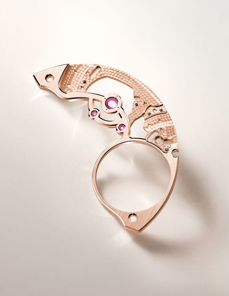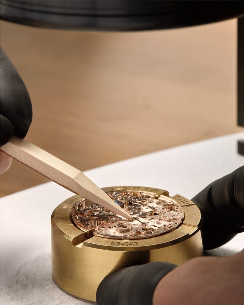 Blancpain dispose d’un atelier de décoration où les artisans perpétuent les techniques traditionnelles. Pour mettre en valeur ce travail, la platine et les ponts sont en or 18 ct, matériau exigeant, mais d’un rendu incomparable.