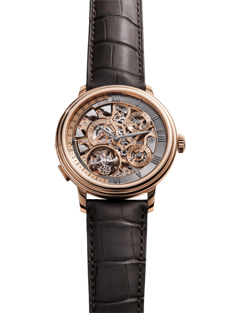 Ce qui semblait impossible lors de la naissance du projet a finalement vu le jour : la Grande Double Sonnerie est devenue une réalité et constitue une première mondiale. Cette grande sonnerie, petite sonnerie et répétition minutes capable de jouer deux mélodies dans n’importe quel mode de sonnerie est associée à un tourbillon volant et à un calendrier perpétuel rétrograde, ouvrant de nouvelles perspectives dans l’univers des grandes complications.
