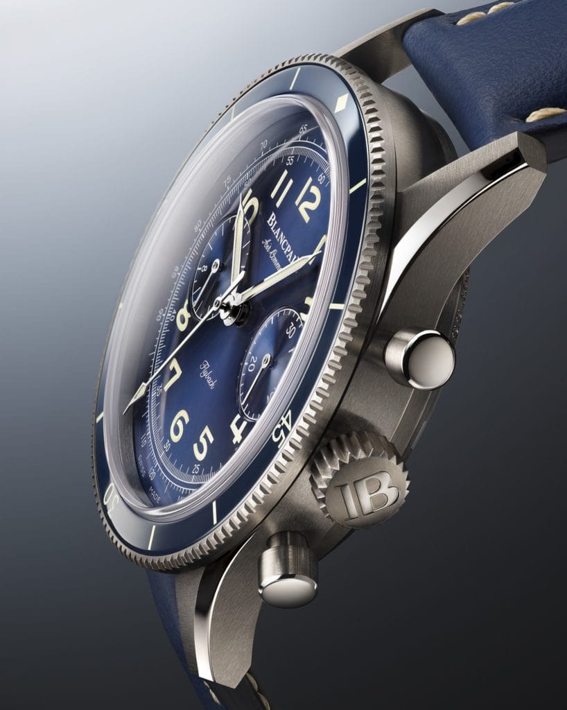 Chronographe Flyback · heures / minutes · échelle tachymétrique · lunette titane bidirectionnelle avec insert en céramique bleue et index en Super-LumiNova® · cadran bleu soleillé · automatique