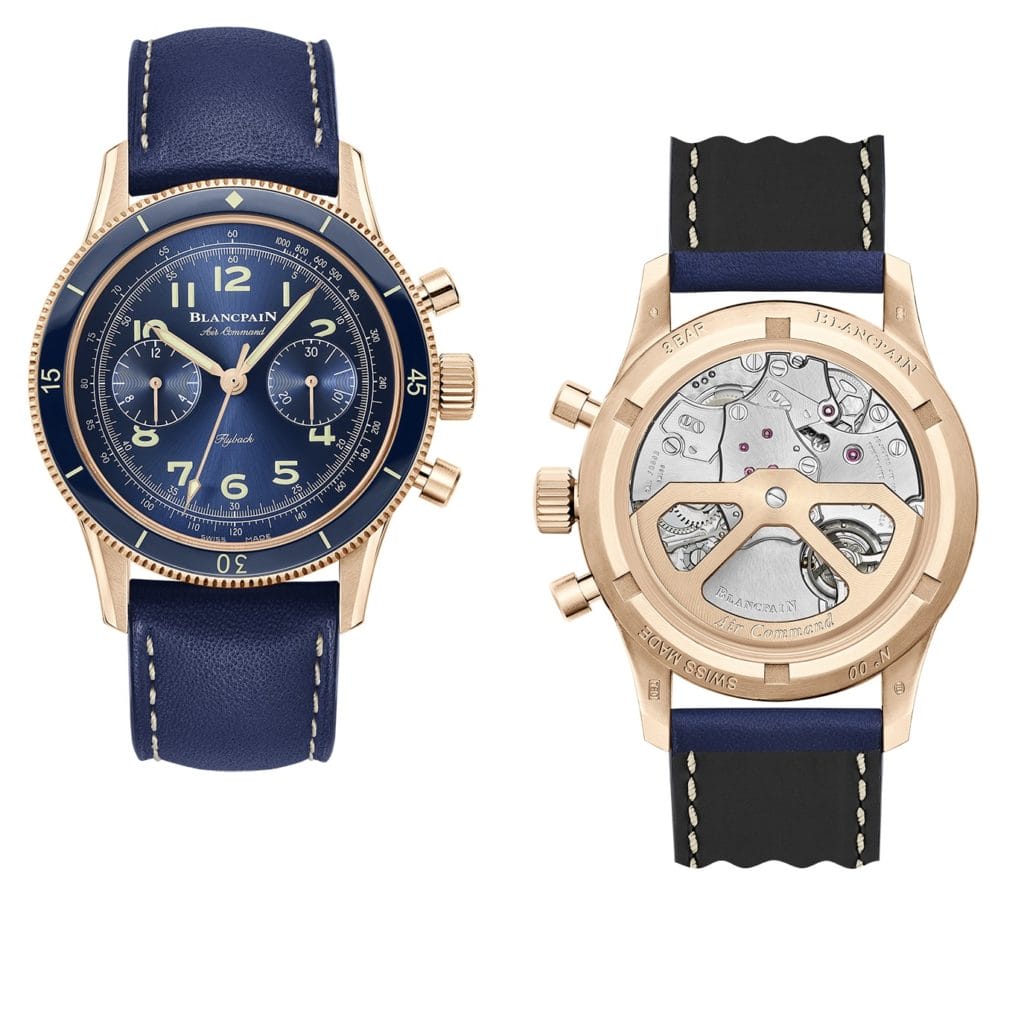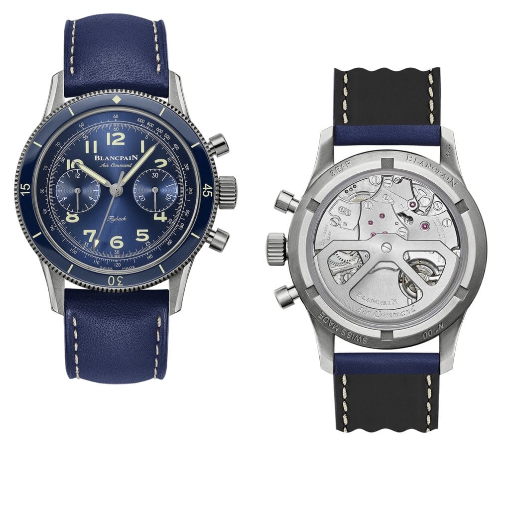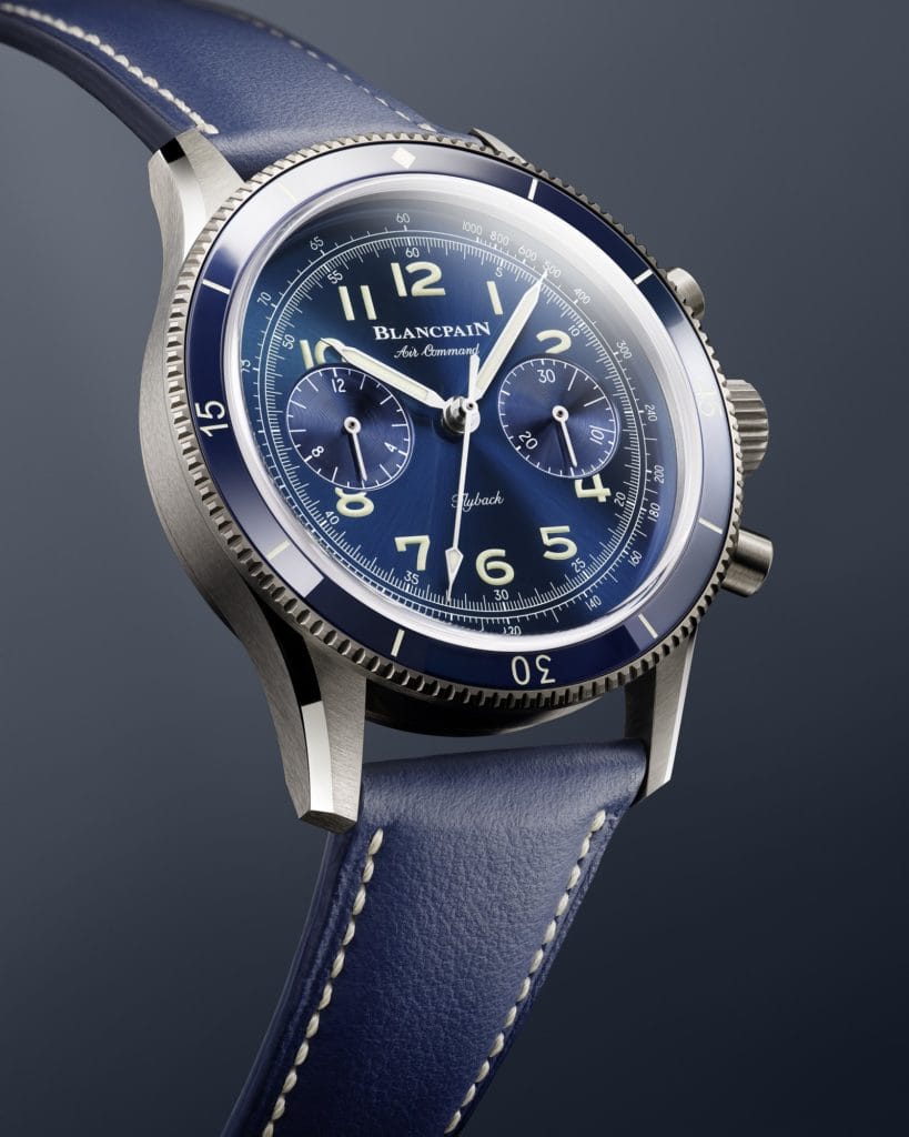 Blancpain a choisi de mettre en valeur ces indications à travers un bleu profond qui dynamise le caractère de la montre, lui conférant une juste dose de modernité. Le cadran est sublimé par un fin soleillage, tandis que les compteurs du chronographe sont azurés. Ce contraste renforce la lisibilité de la pièce, qui est idéale de jour comme de nuit grâce à l’utilisation d’index et d’aiguilles en Super-LumiNova®. Ce matériau luminescent se retrouve sur la lunette de la montre, qui intègre un insert en céramique inrayable assorti à la couleur du cadran. Afin de décupler l’émotion que procure un garde-temps de cette trempe, Blancpain a équipé les deux faces de son modèle Air Command d’un verre saphir « glass box », un élément esthétique fort des modèles des années 1950.