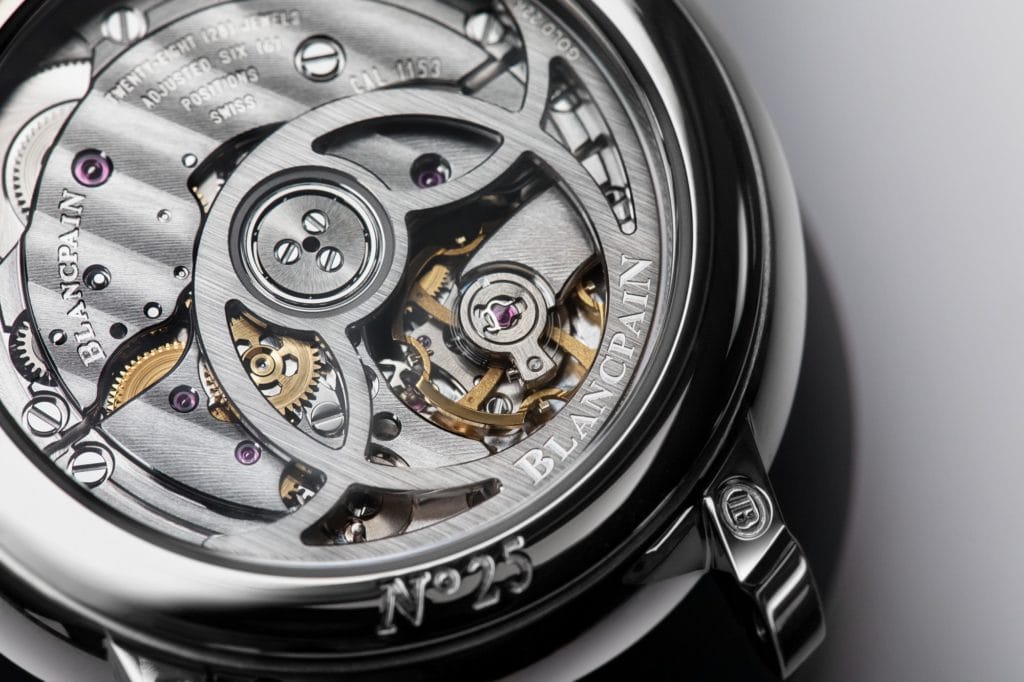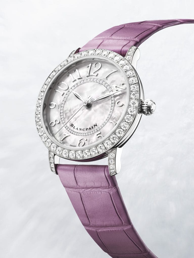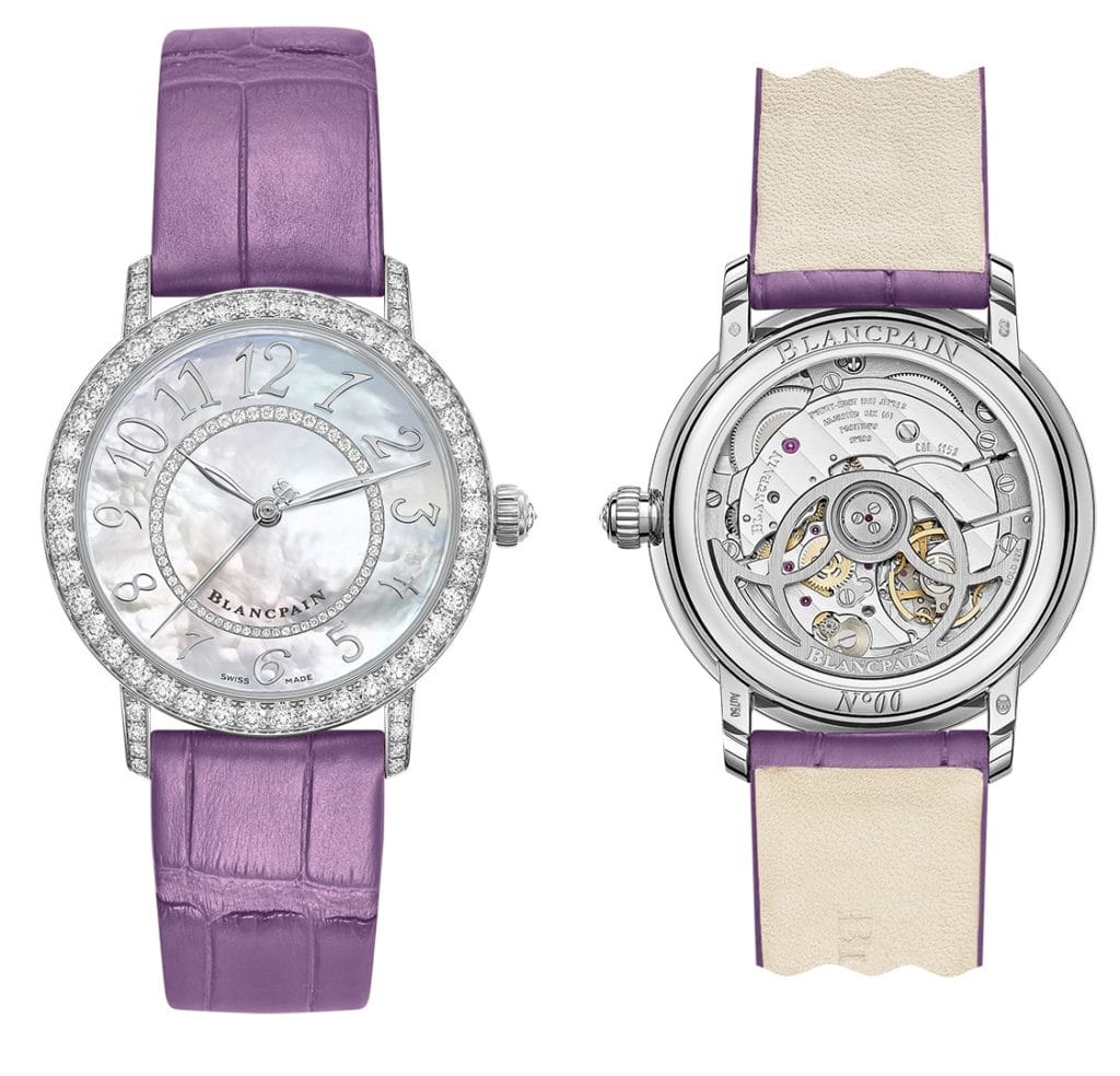 Réalisé en nacre blanche, le cadran de la montre est orné de chiffres arabes appliques en or légèrement arrondis, dimensionnés de sorte à former un tour d’heures asymétrique couronné par le nombre 12. Un bandeau de diamants souligne les index tout en étreignant les aiguilles, dont celles des heures et des minutes sont en forme de feuilles de sauge évidées, un attribut Blancpain par excellence.