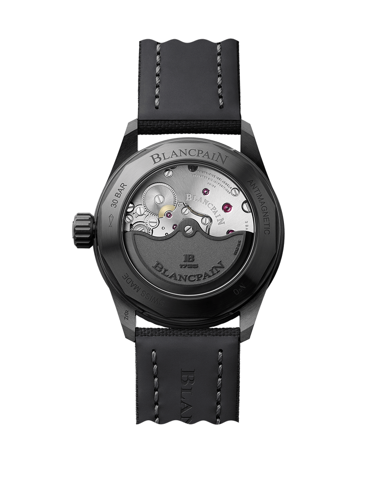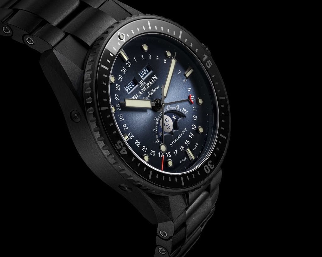 A la différence des années 1950, où les balanciers des montres étaient équipés de ressorts métalliques susceptibles d’être magnétisés – d’où le développement d’une cage intérieure en fer doux servant de bouclier pour protéger le mouvement du magnétisme – , les Fifty Fathoms contemporaines disposent d’un spiral en silicium, ce qui leur permet d’arborer un fond saphir et ainsi d’exposer la construction unique de leur mouvement. Bénéficiant d’une telle technologie, la nouvelle Bathyscaphe Quantième Phase de Lune affiche non seulement fièrement la grande qualité des finitions de son mécanisme, mais elle jouit également de performances chronométriques supérieures grâce à ce matériau.