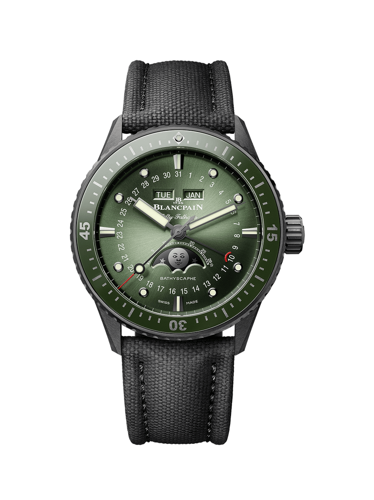 Animée par le calibre 6654.P, la nouvelle Bathyscaphe Quantième Complet Phases de Lune met en avant son héritage en termes de montre de plongée, à l’image de sa lunette tournante, ainsi que les éléments de Haute Horlogerie qui caractérisent Blancpain, tels que la phase de lune et le spiral en silicium.