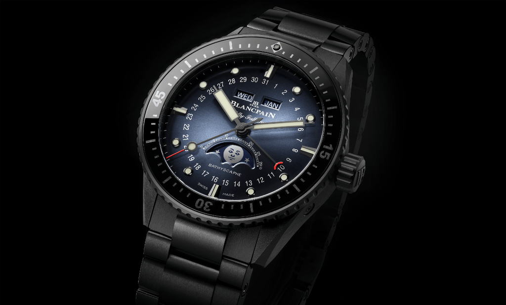 Blancpain se réjouit de dévoiler sa nouvelle Bathyscaphe Quantième Complet Phases de Lune, qui se présente désormais habillée d’un bracelet en céramique noire breveté à la réalisation complexe, ainsi que d’un boîtier de même matériau. Revêtant un style sportif et affirmé tout en faisant preuve d’une grande élégance, ce modèle affiche un cadran aux vibrantes nuances bleues soleillées. Disponible avec un choix de bracelets allant de la céramique au NATO en passant par la toile de voile, la nouvelle Bathyscaphe Quantième Complet Phases de Lune apporte force, couleur et dynamisme à la ligne Bathyscaphe.