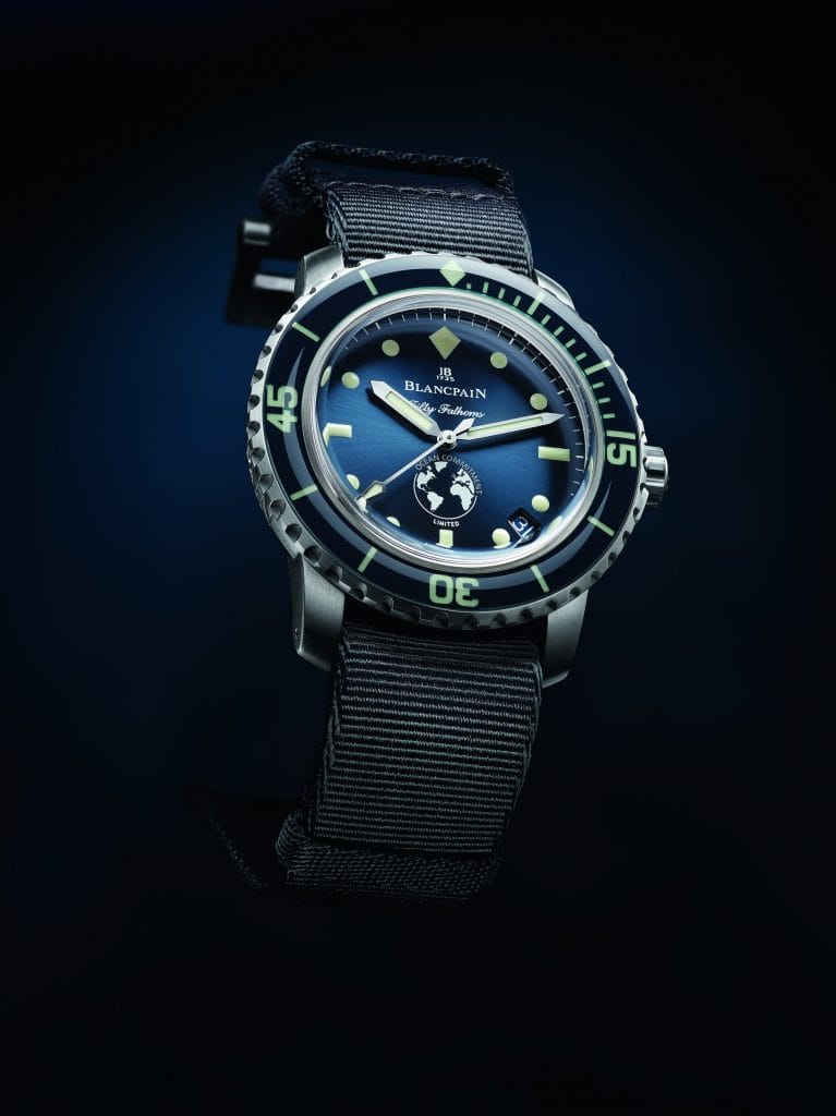 La Fifty Fathoms Ocean Commitment III est proposée dans un boîtier en acier satiné de 40 mm, un diamètre exclusif aux montres Fifty Fathoms en éditions limitées. Elle est livrée sur un bracelet toile de voile et s’accompagne d’un bracelet NATO additionnel, tous deux assortis à la couleur du cadran et de la lunette.