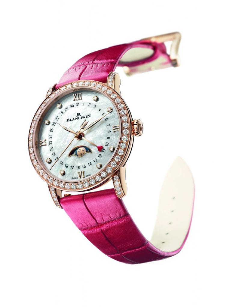 La Maison a imaginé un habillage raffiné pour son quantième à phases de lune, l’une des complications les plus poétiques des modèles pour dames de sa collection Villeret. La pièce spéciale « Saint-Valentin 2019 » se pare ainsi d’un cadran en nacre naturelle blanche, dont les reflets irisés et les nuances cotonneuses évoquent un décor céleste. En guise d’index, huit diamants taille brillant ont été soigneusement sertis puis fixés sur la nacre, dont l’extrême fragilité ne laisse place à aucune marge d’erreur. Le tour d’heures est complété par des appliques en or rouge représentant les chiffres 3, 6, 9 et le nombre 12. Il est survolé par de fines aiguilles en forme de feuilles de sauge évidées assorties. Une trotteuse façonnée à l’image d’une flèche de Cupidon marque les secondes, tandis qu’une quatrième aiguille terminée par un cœur laqué rouge indique la date. La phase de lune est positionnée à 6h, dans un guichet aux bords arrondis et cerclé d’un liseré doré. Typique des garde-temps féminins de Blancpain, la lune arbore un visage enjoué qui se distingue par une mouche placée sur le coin de son sourire. A l’origine, les mouches étaient utilisées par les dames des cours européennes au XVIIIème siècle en tant qu’éléments de parure.
