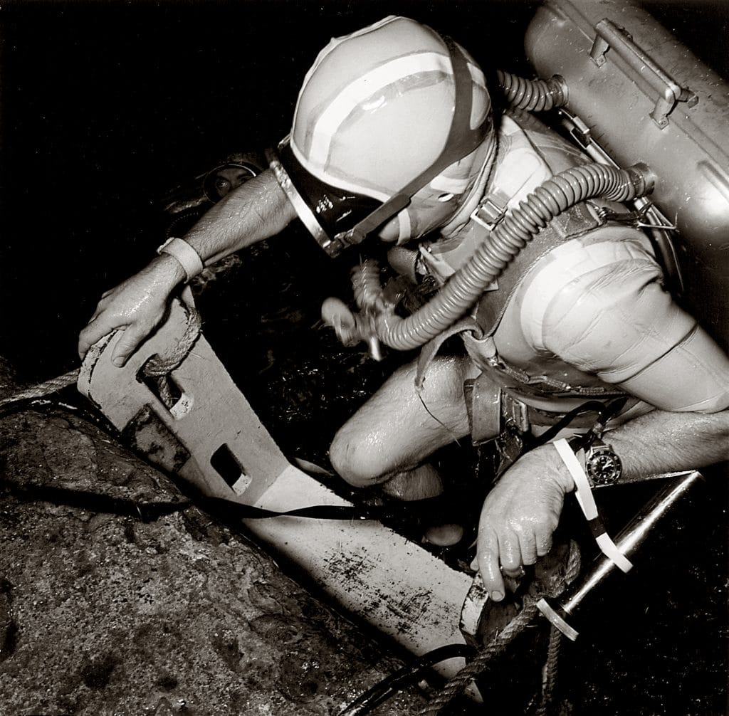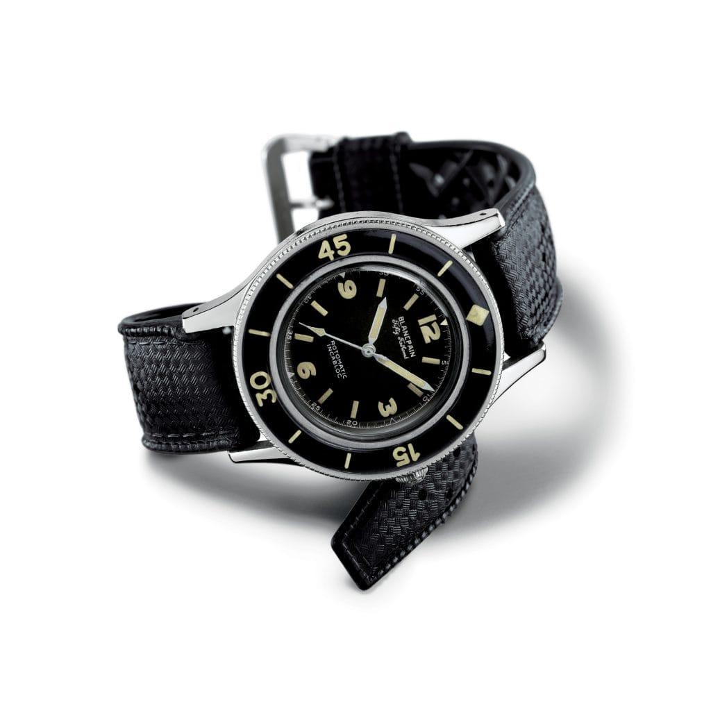 A son arrivée à la tête de Blancpain en 1950, Jean-Jacques Fiechter, lui-même plongeur émérite, commence à travailler sur un instrument de mesure du temps fiable et robuste destiné à l’accompagner lors de ses aventures sous-marines. Il s’agit d’un défi de taille puisqu’il n’existe à cette époque aucun précédent horloger pouvant servir de modèle. Guidé par ses propres expériences, il définit et met au point les spécifications fondamentales qu’une montre véritablement dédiée à la plongée autonome doit réunir : des aiguilles et index luminescents contrastant avec un cadran foncé, une lunette tournante sécurisée, un mouvement automatique, une parfaite étanchéité, ainsi qu’un boîtier antimagnétique.