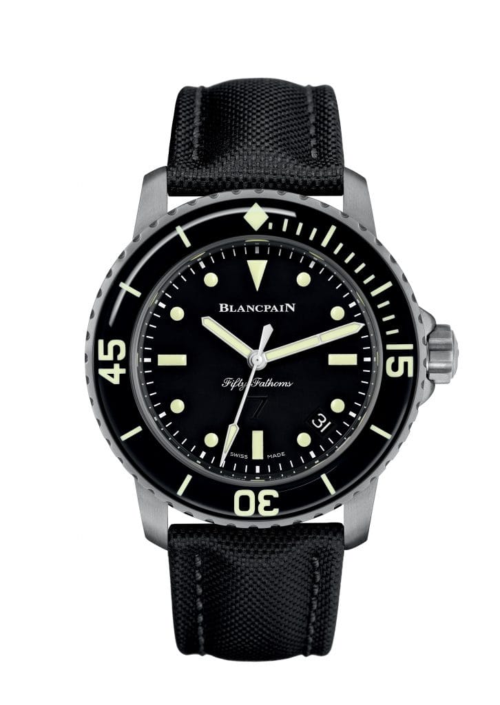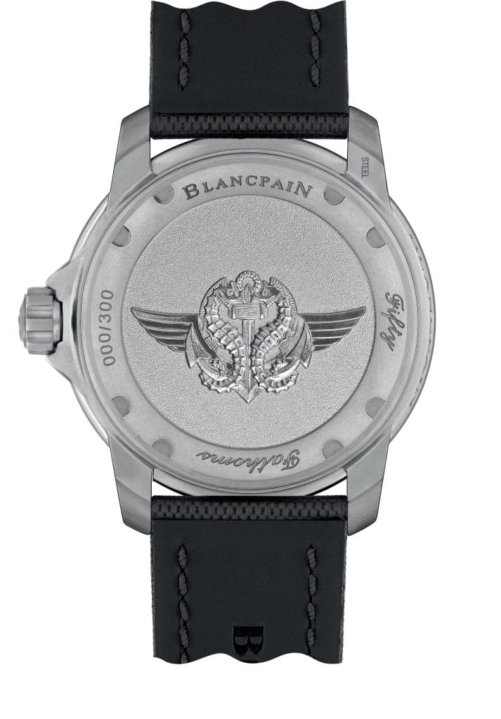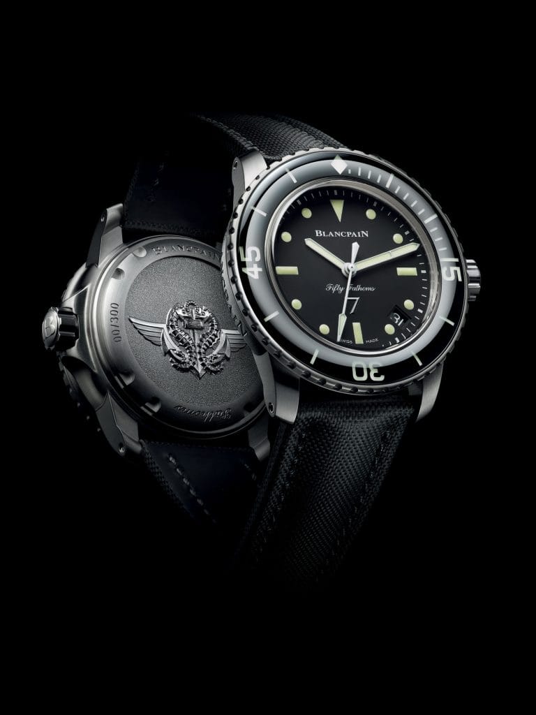 En hommage à son étroite collaboration avec les fondateurs de l’unité des Nageurs de combat français, Blancpain a souhaité dévoiler une édition spéciale de sa montre de plongée Fifty Fathoms. La Manufacture a ainsi frappé le fond de son nouveau modèle de l’insigne du certificat des Nageurs de combat : une ancre centrale, dédiée aux marins, est enlacée par deux hippocampes ailés représentant à la fois l’univers sous-marin et les parachutistes. Sur le côté face de la montre apparaît en toute discrétion un second emblème, le chiffre 7. L’oxygène devenant toxique à pression partielle de 1,7 bar, la profondeur maximale que peuvent atteindre les plongeurs militaires respirant de l’oxygène pur est de 7 mètres, un chiffre devenu fétiche dans ce milieu.