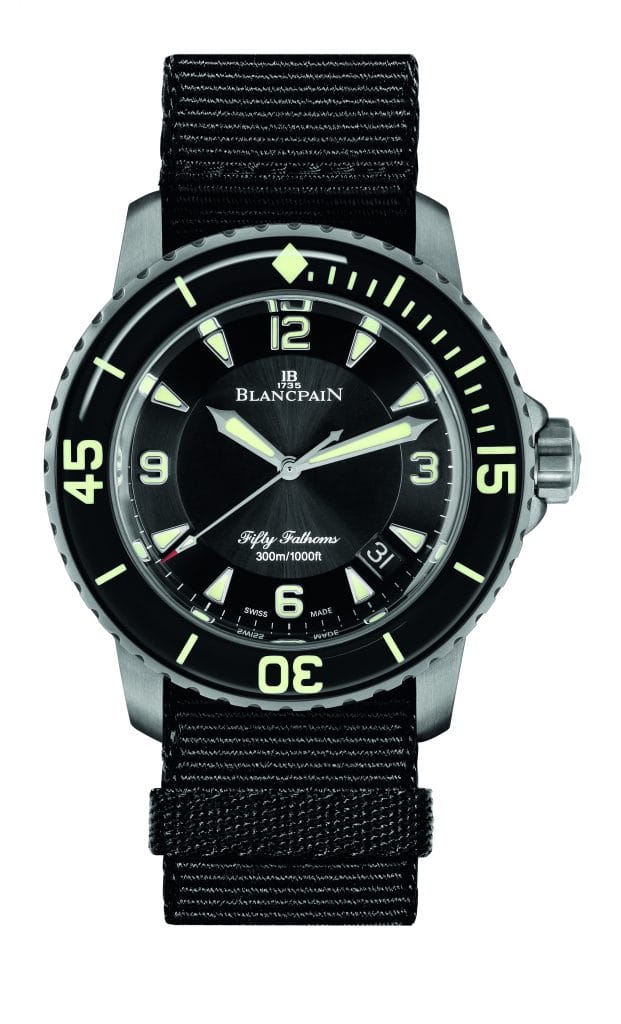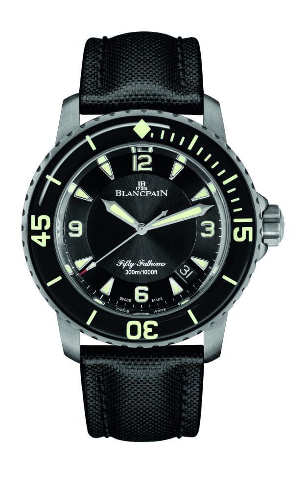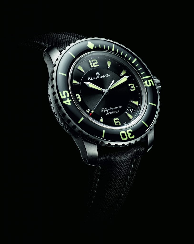Réputé pour sa robustesse ainsi que sa haute résistance aux chocs et à la corrosion, le titane possède de surcroît une faible densité le rendant particulièrement léger. Cet atout de taille, qui le distingue de l’acier, a permis à Blancpain de réaliser une pièce de large diamètre, offrant toutes les garanties techniques d’un instrument de plongée sans qu’elles ne se fassent ressentir au poignet. Les plongeurs apprécieront sans doute cet avantage, en particulier lors de plongées nécessitant un équipement sportif déjà conséquent, à l’instar des citadins désireux de porter quotidiennement un garde-temps aux proportions généreuses et aérien à la fois.
