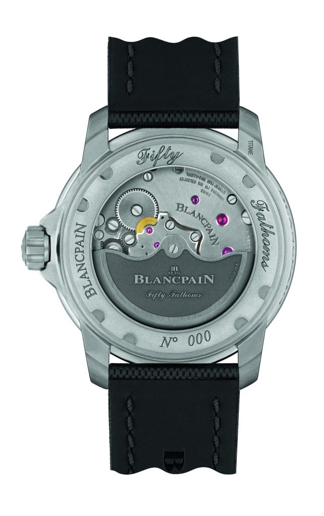 D’un diamètre de 45 mm et étanche à 300 mètres, la nouvelle Fifty Fathoms Automatique en titane possède une lunette tournante unidirectionnelle au relief cranté, dotée d’un insert inrayable en saphir bombé noir. Pour une visibilité accrue en toutes circonstances, ses repères, les index du cadran ainsi que les aiguilles sont en Super-LumiNova®. Ce revêtement contraste de façon idéale avec le visage noir soleillé de la montre. Au dos, le mouvement est visible derrière un fond en verre saphir. Il s’agit du célèbre 1315 de Blancpain, qui se caractérise notamment par une réserve de marche optimale de 5 jours, rendue possible grâce à l’utilisation de trois barillets montés en série, pourvus de ressorts à haute performance. Il possède un spiral en silicium qui le protège des effets négatifs du magnétisme sans qu’il ne soit nécessaire de l’isoler derrière une cage métallique. Ses finitions soignées, réalisées dans la plus pure tradition horlogère, en font un mouvement aussi beau que fiable : traits étirés, anglage, perlage et cerclage sont autant de techniques qui rehaussent l’exclusivité de cette nouvelle Fifty Fathoms Automatique.