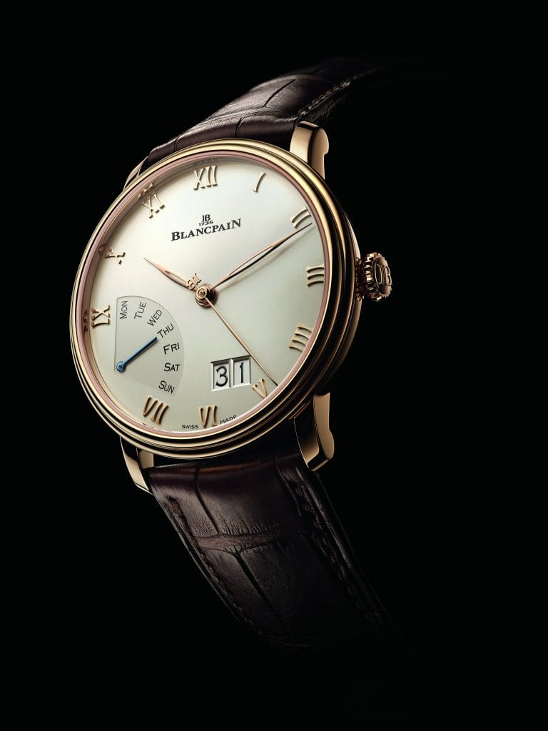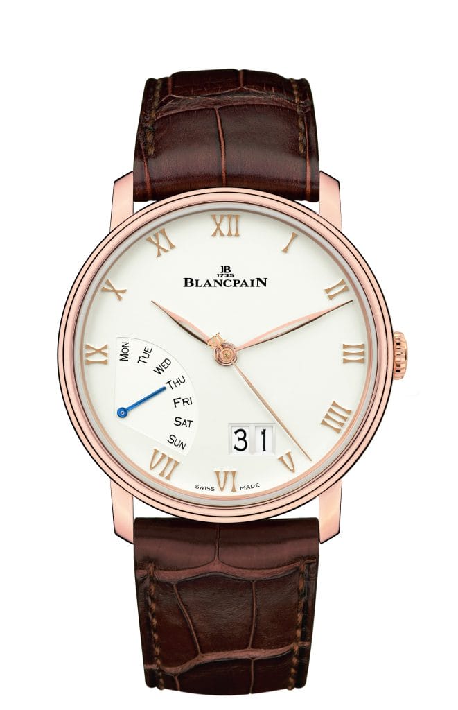Blancpain introduit cette année une nouvelle complication dans la collection Villeret : un jour de la semaine rétrograde. Présentée sur le modèle Villeret Grande Date Jour Rétrograde, cette indication est complétée par une grande date à double guichet.