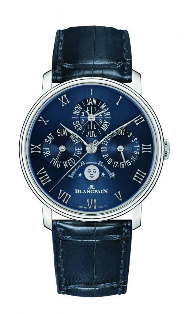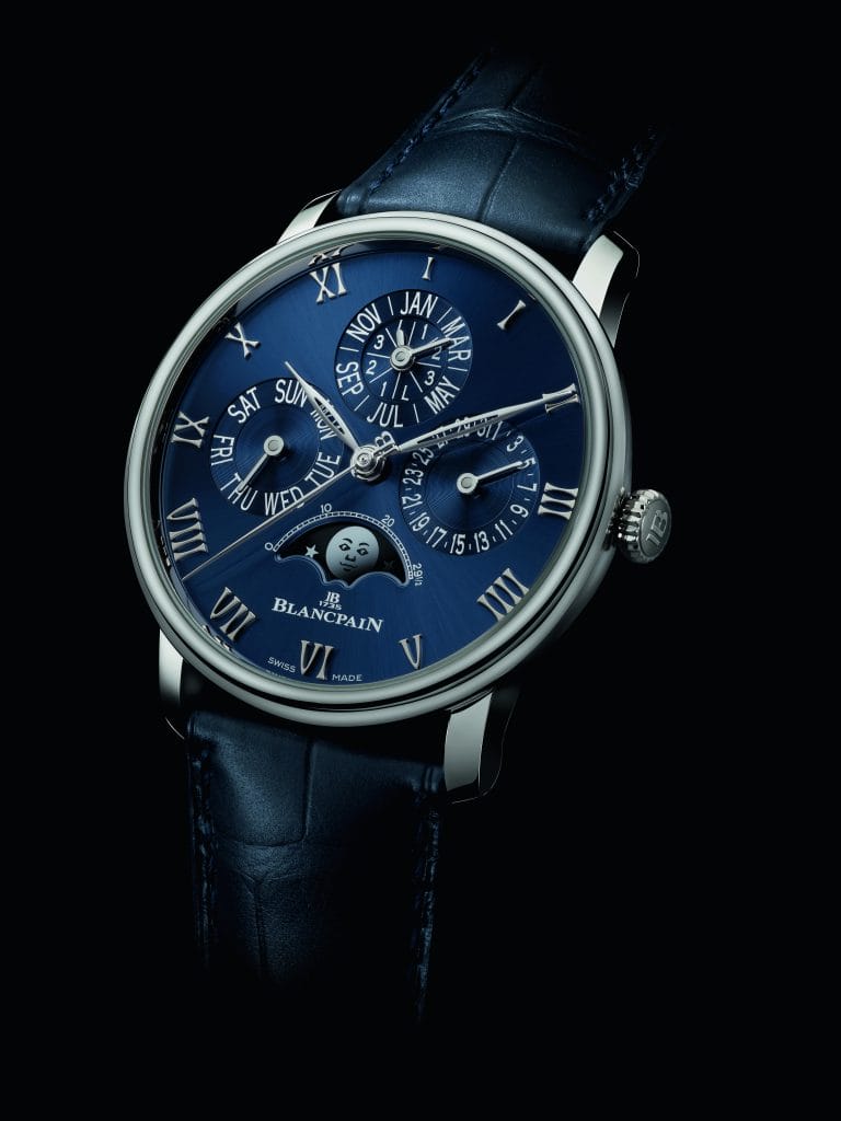 Quantième Perpétuel · phases de lune · indication de l’année bissextile · seconde · correcteurs sous cornes · mouvement sécurisé · cadran bleu · automatique