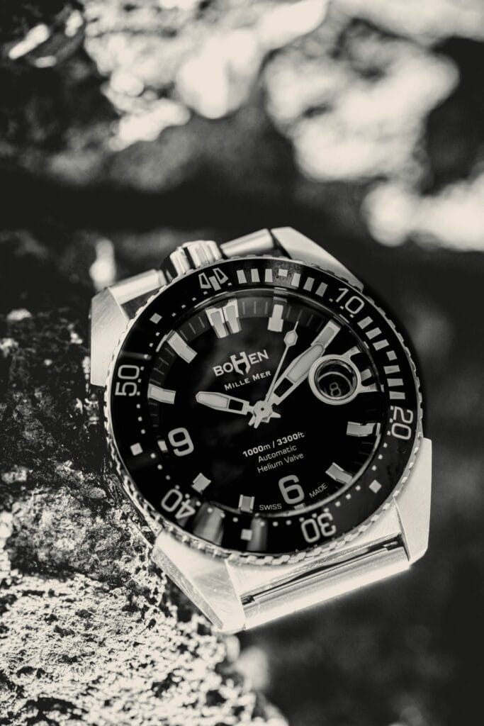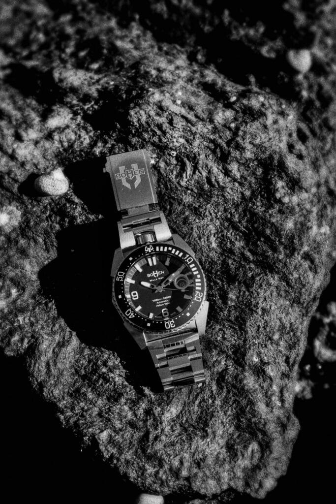 Première montre créée par la jeune marque Bohen, la Mille-Mer éditée à 500 exemplaires se distingue par son étanchéité record à 1 000 mètres, et son esthétique non conventionnelle.