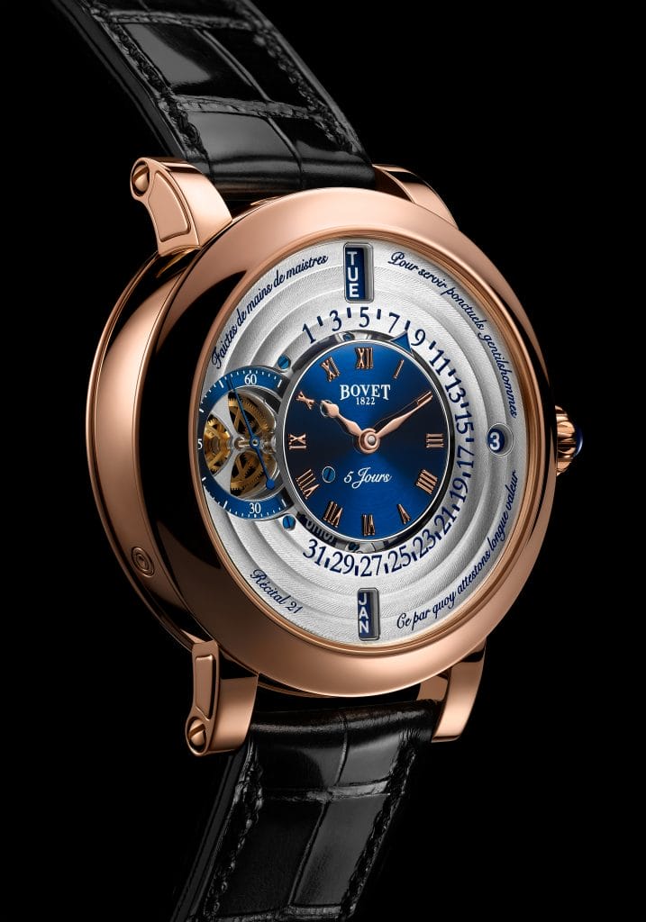 Le souci d’afficher des informations utiles et lisibles et de pouvoir les régler intuitivement lors d’un usage quotidien préside au développement de chaque garde-temps et le Récital 21 n’y fait pas exception. Les aiguilles d’heures et de minutes occupent le centre du garde-temps laissant davantage de place en périphérie pour les informations du quantième perpétuel. A l’exception du quantième, indiqué par un index rétrograde rayonnant autour des heures et des minutes, ce sont des disques qui affichent les jours et les mois dans des guichets verticaux, respectivement à 12h et 6h ainsi que le cycle bissextile dans un guichet circulaire positionné à 3h. L’aiguille des secondes, excentrée à 9h équilibre harmonieusement l’ensemble en venant compléter les indications visibles au porté. Pour une fiabilité et une longévité accrues, les horlogers de BOVET 1822 ont développés un mécanisme qui freine l’indicateur lors de son saut rétrograde. Un détail qui s’apprécie visuellement chaque premier de mois.