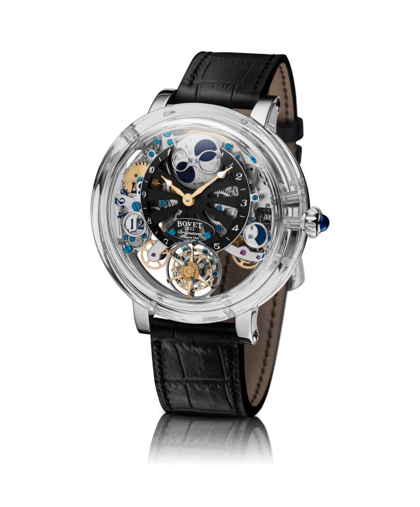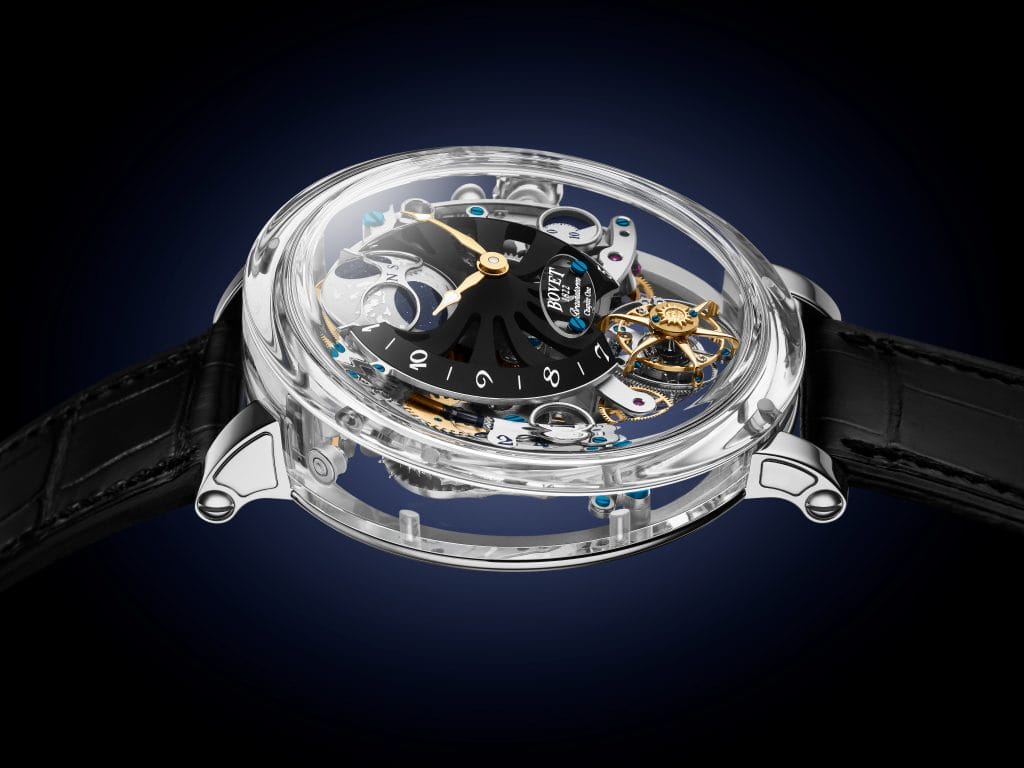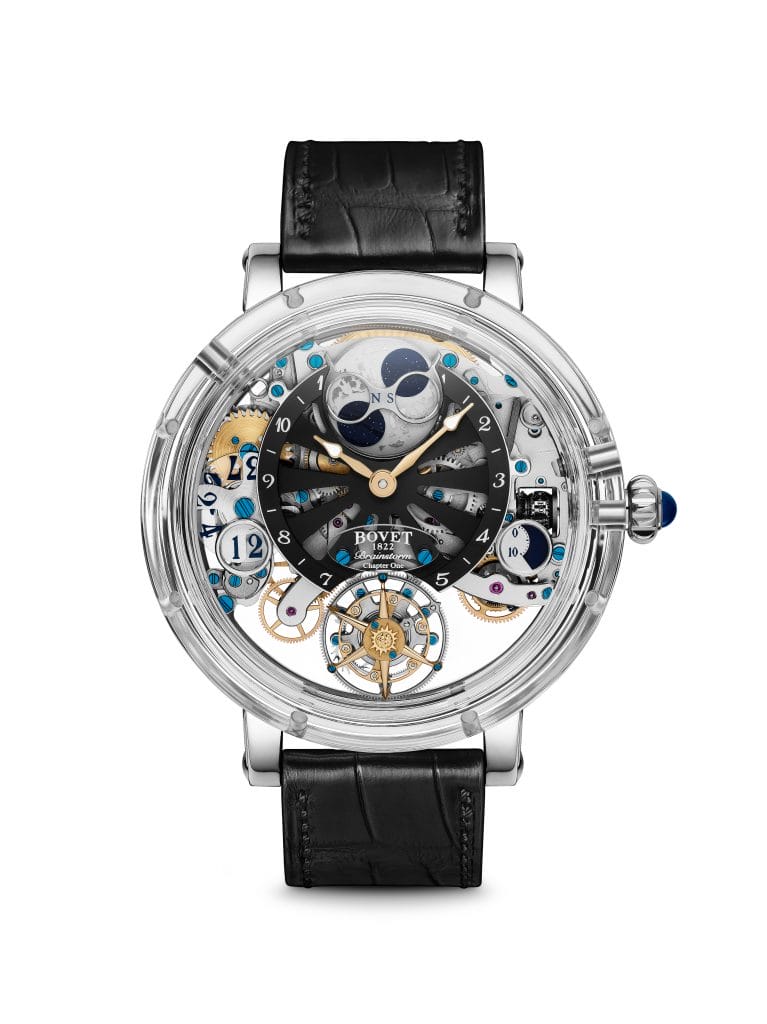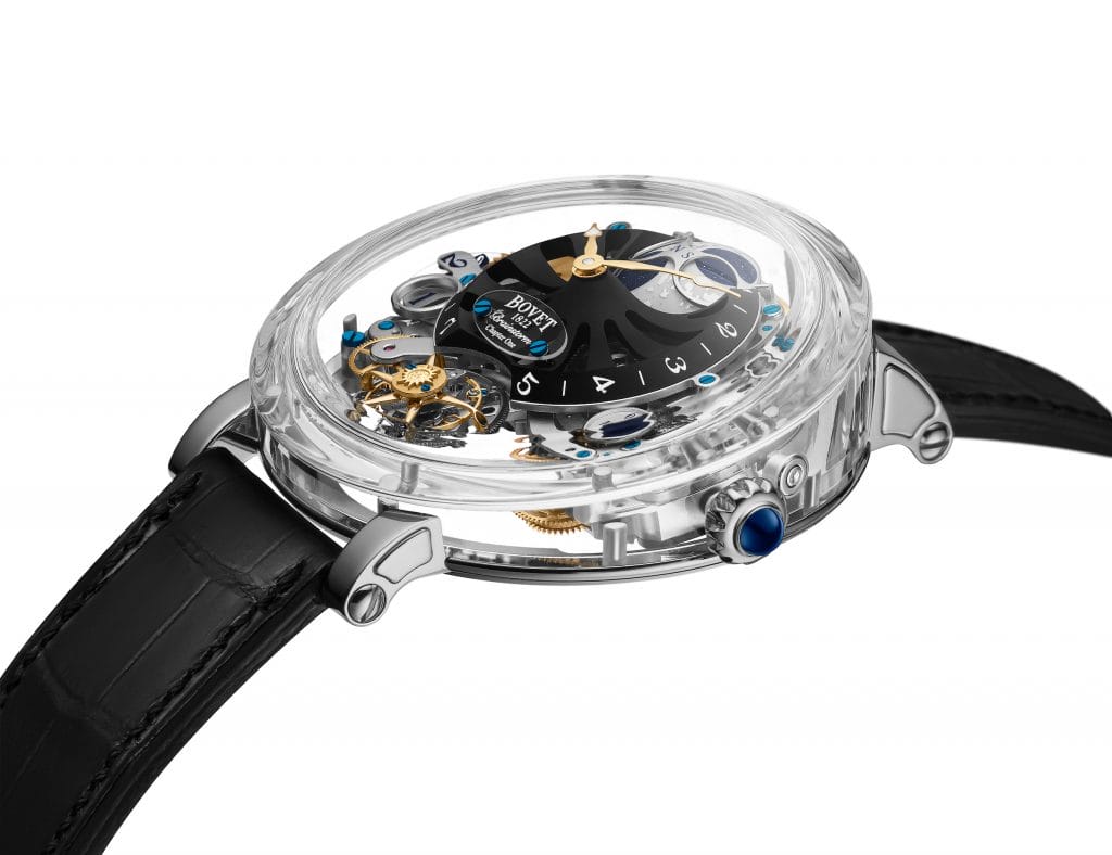 A terme, carrure et glace ne forment qu’un seul élément qui respecte scrupuleusement le dessin originel des boîtiers de la collection et la courbure caractéristique de leur carrure en particulier. Le fond se constitue d’une lunette et des quatre cornes usinées en titane gr. 5. Bien entendu cette lunette porte une glace de saphir qui s’ouvre généreusement sur le fond d’un mouvement qui a beaucoup de secrets à dévoiler. Afin d’optimiser transparence et ergonomie, les horlogers de BOVET 1822 ont décidé de fixer le mouvement au fond plutôt qu’à l’intérieur de la carrure comme cela est usuellement le cas. Un choix qu’ils avaient déjà expérimenté avec succès dans la construction du non moins lumineux Tourbillon Ottantasei en 2016.