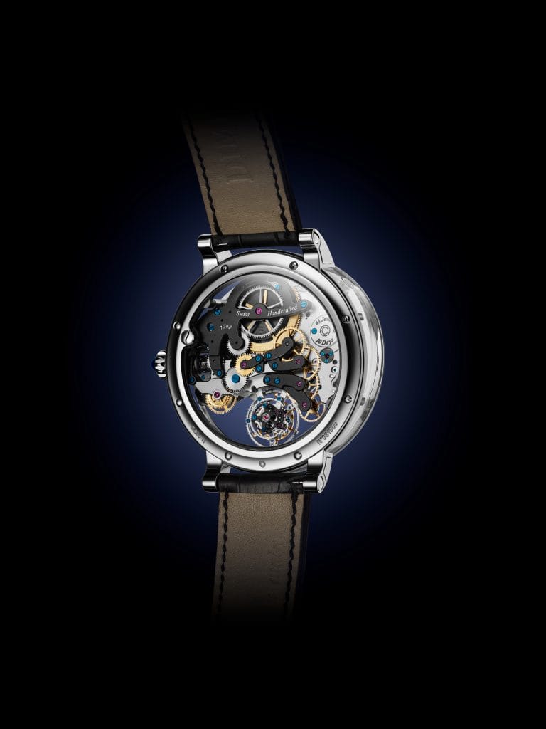 Bien que l’ensemble des complications présentes et leur mise en scène inédite soient particulièrement époustouflantes et justifient pleinement l’usage du saphir de ce boitier, il faut pivoter ce dernier pour observer le mouvement par le côté et en apprécier le plus grand secret. Sous cet angle de vue, on remarque immédiatement la construction atypique du mouvement.