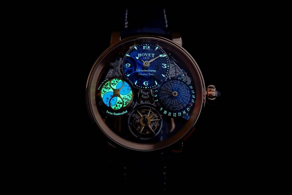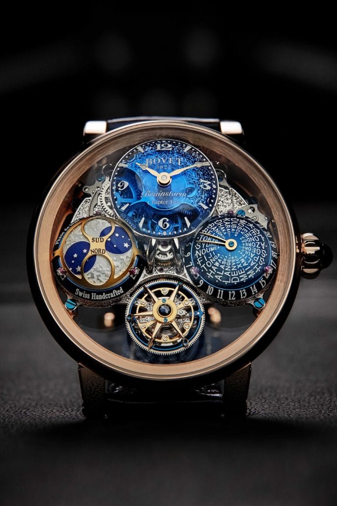 Le nouveau calibre développé pour le Brainstorm Chapter Two est entièrement fabriqué dans les ateliers de Bovet 1822. Idéale pour un garde-temps à fuseaux horaires multiples, la maîtrise de l’énergie des horlogers de BOVET permet de garantir une autonomie de cinq jours par l’usage d’un unique barillet, à une fréquence de 21’600 A/h, pour une chronométrie d’exception agrémentée du tourbillon volant double face breveté. Un cadran-dôme, proposé dans une variété de couleurs (quartz bleu ou vert, aventurine bleue et personnalisations), affiche les heures et les minutes de l’heure locale, dans la partie supérieure du boîtier. Les secondes se lisent par un index fixé sur le tourbillon lui-même, placé à 6H, qui effectue une révolution complète en 60 secondes. Enfin, deux dômes rotatifs placés respectivement à 3H et 9H complètent harmonieusement la quadrature. Celui situé à 3H affiche un second fuseau horaire, spécifiquement développé pour ce gardetemps et faisant l’objet d’un brevet.