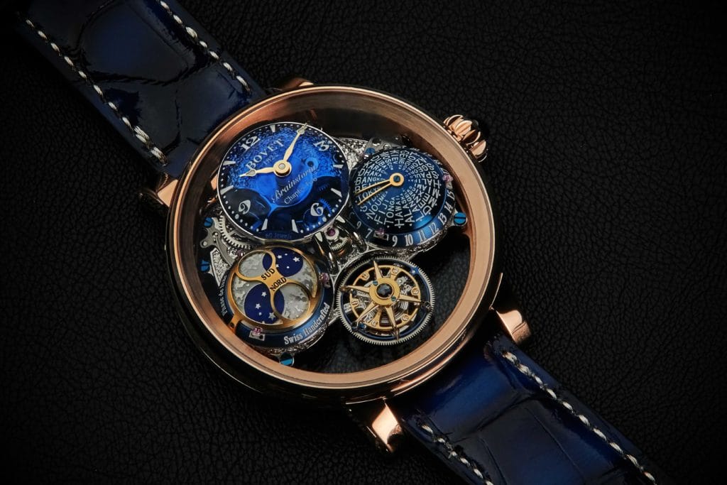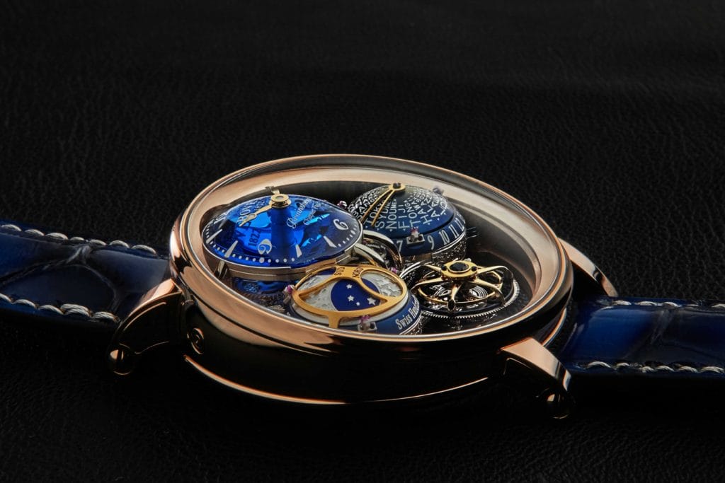 Les noms des villes représentant les 24 fuseaux horaires sont imprimés sur le dôme qui effectue un tour complet en 24 heures. Une aiguille tridimensionnelle en V permet au collectionneur de sélectionner le fuseau horaire qu’il souhaite afficher. Cette combinaison astucieuse et innovante, conjuguée au dôme, offre une lisibilité optimale, malgré le diamètre réduit de l’ensemble de cet affichage. Cet affichage inédit offre, en plus de la lecture d’un second fuseau horaire, la fonction d’heure universelle qui permet de connaître simultanément l’heure de chacun des 24 fuseaux horaires, une indication intuitive qui n’a jamais trouvé pareille justification qu’à l’heure de l’ultra-connectivité. En parfaite symétrie, l’indicateur de phase de lune est positionné à 9H et est également assuré par un dôme rotatif. La surface lunaire y est gravée à la main avant que de la matière luminescente n’y soit appliquée, elle aussi à la main.