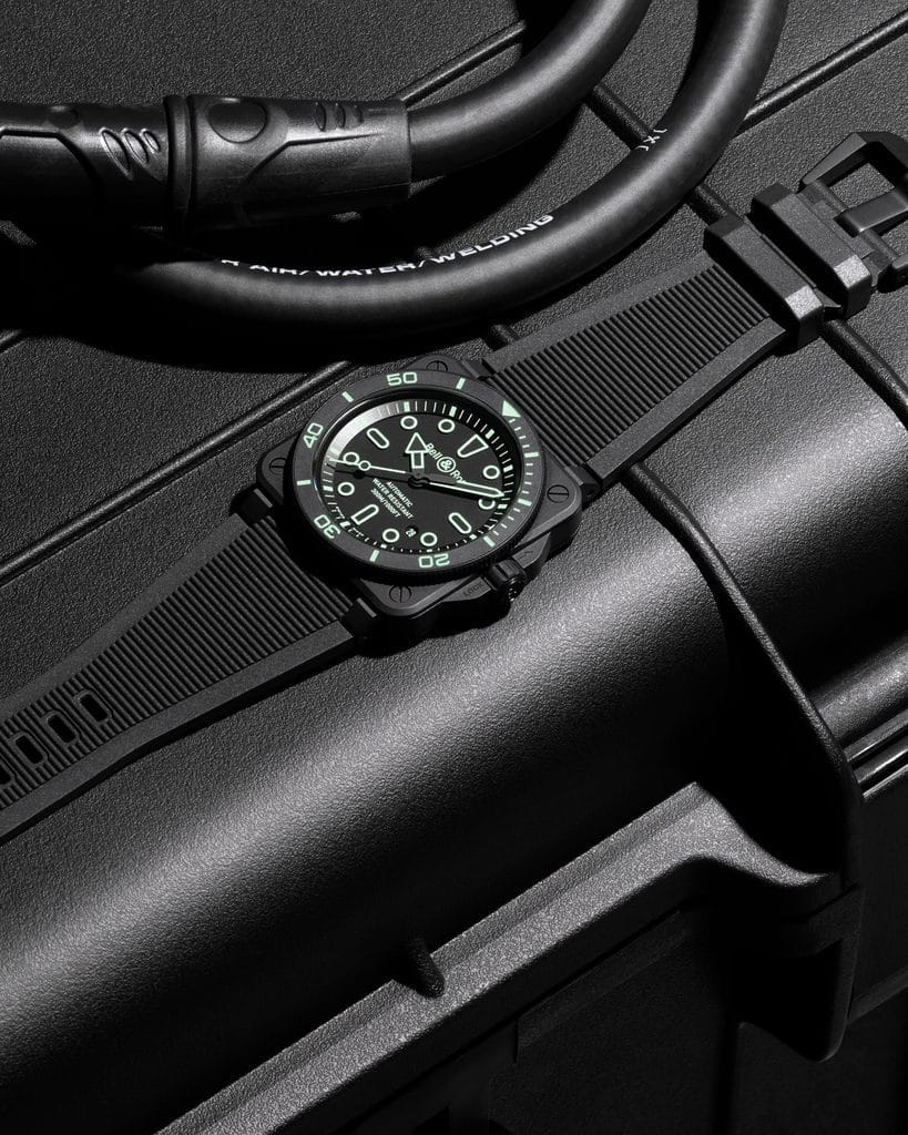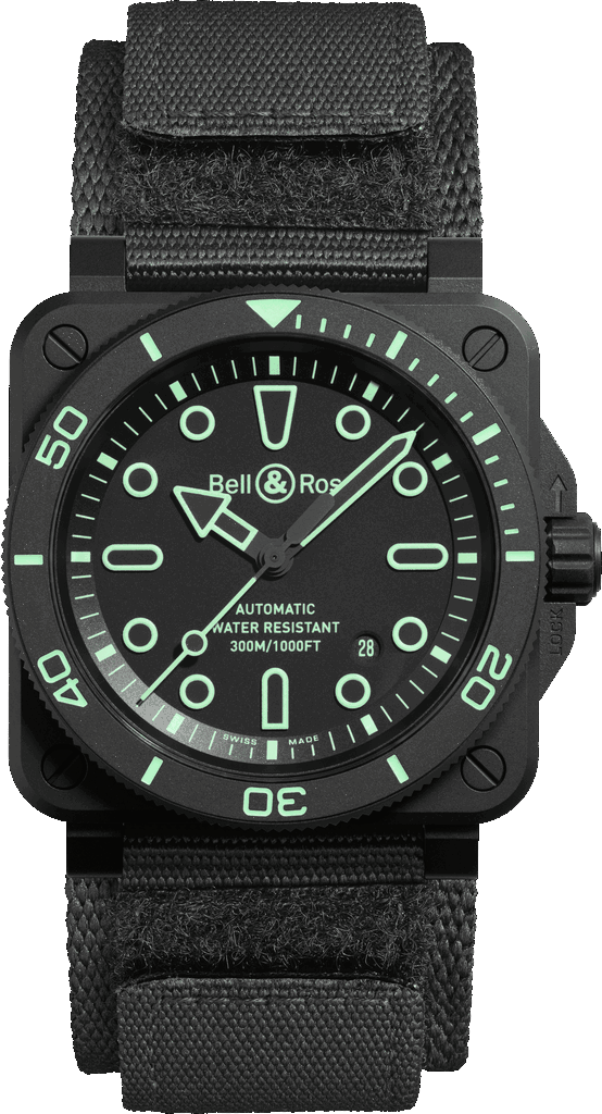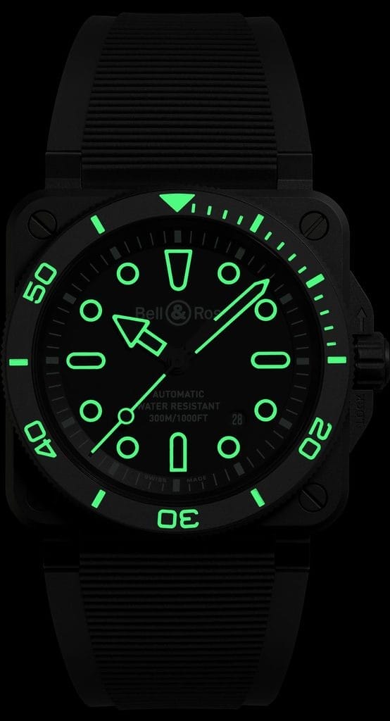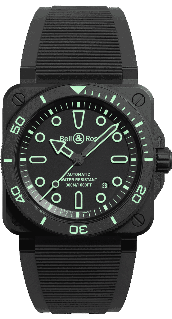 Fidèle à son ADN d’outil professionnel, Bell & Ross a développé la BR 03 Diver Lum Outline en étroite collaboration avec des plongeurs. Le boîtier carré en céramique noire microbillée de 42 mm est doté d’une lunette tournante unidirectionnelle graduée sur 60 minutes, elle aussi remplie de Super-LumiNova®. La montre est étanche jusqu’à 300 mètres, conformément à la norme ISO 6425, gage de performance en conditions extrêmes.
