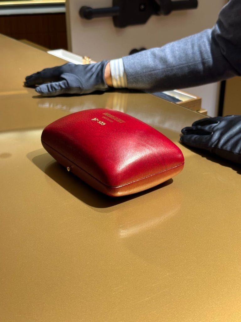 L’ensemble est présenté dans un écrin rouge en cuir inspiré des étuis en maroquin d’époque. Sa silhouette galet, ses tissus bleus et sa fermeture à bouton-poussoir prolongent le raffinement jusque dans le rangement.