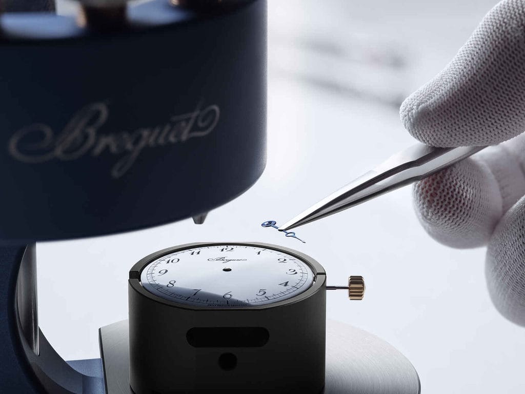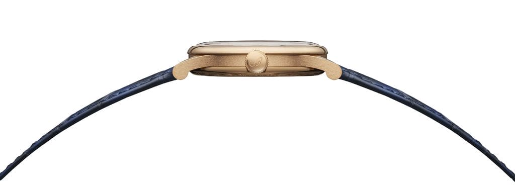 Le boîtier de 40 mm, aux lignes redessinées, adopte une carrure satinée sans cannelures, conformément aux pièces d’époque. Il est façonné en or Breguet 18K, un nouvel alliage exclusif mêlant or, argent, cuivre et palladium. Sa teinte blonde, chaleureuse, évoque les nuances des ors anciens, tout en garantissant une excellente stabilité dans le temps. La glace saphir de profil chevée — une invention signée Breguet — surplombe l’ensemble avec discrétion.