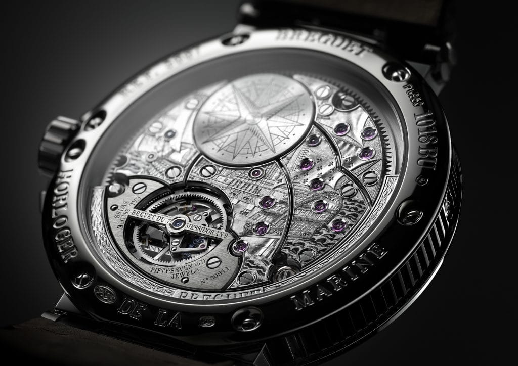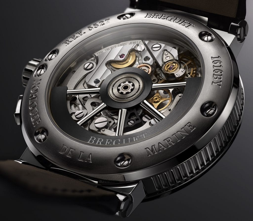 De nombreux détails se réfèrent au monde nautique. Sur les ponts du calibre, les côtes de Genève guillochées évoquent les lignes d’un plancher de navire. L’extrémité de l’aiguille des secondes adopte une forme de « B », soit le « Bravo » marin ou de Breguet. Ou encore, le dessin d’un gouvernail se retrouve dans la boucle déployante ainsi que dans la masse oscillante.