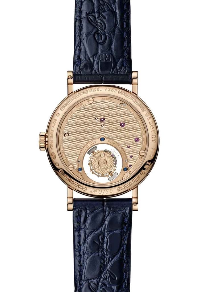 Le boîtier de 38 mm est réalisé dans un or Breguet 18K, un alliage exclusif à la teinte chaleureuse, inspirée des créations du XVIIIe siècle. On y retrouve les attributs distinctifs de la maison : carrure cannelée, cornes droites soudées, verre saphir doublement traité antireflet, et fond gravé « BREGUET 250 YEARS », laissant apparaître un guilloché inédit nommé « Quai de l’Horloge », en hommage à l’adresse historique de la maison parisienne.