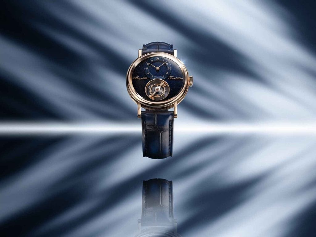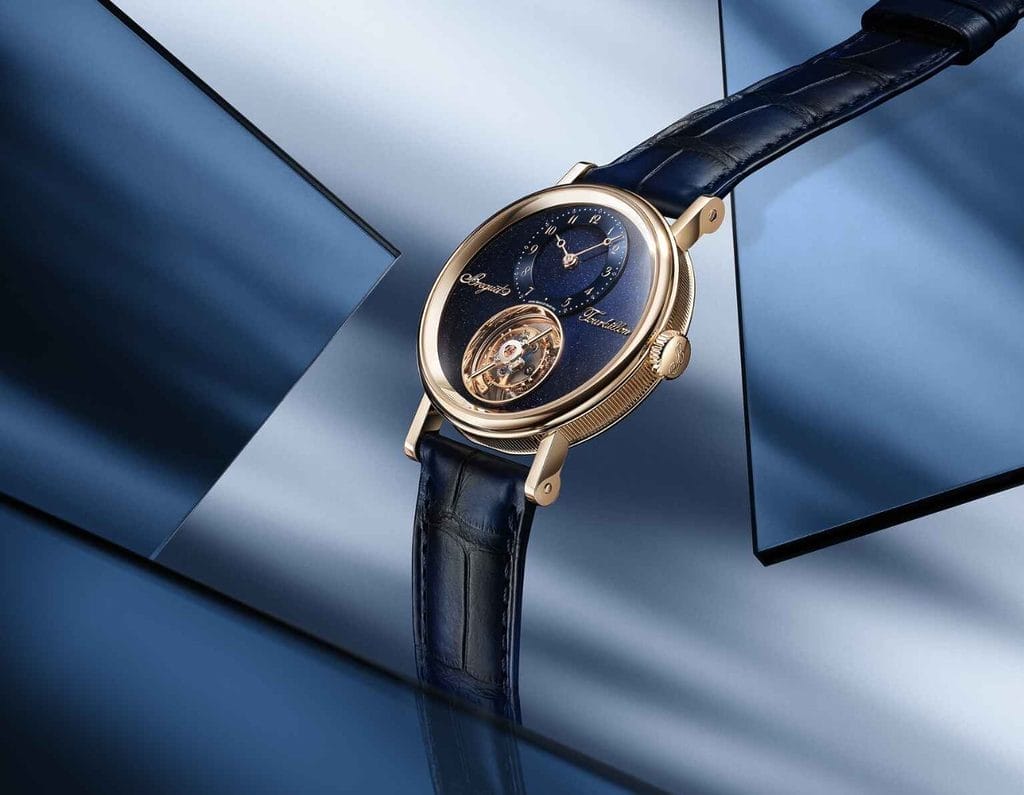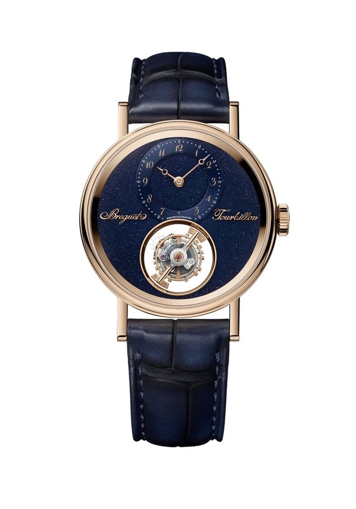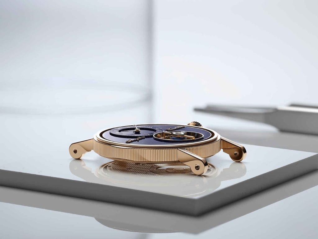 L’affichage des heures et des minutes est excentré à 12 h sur un disque satiné en or traité PVD bleu. Les aiguilles Breguet à pomme évidée, les chiffres arabes caractéristiques, et les appliques “Breguet” et “Tourbillon” en or 18K viennent signer la composition, dans un dialogue constant entre classicisme et expérimentation.