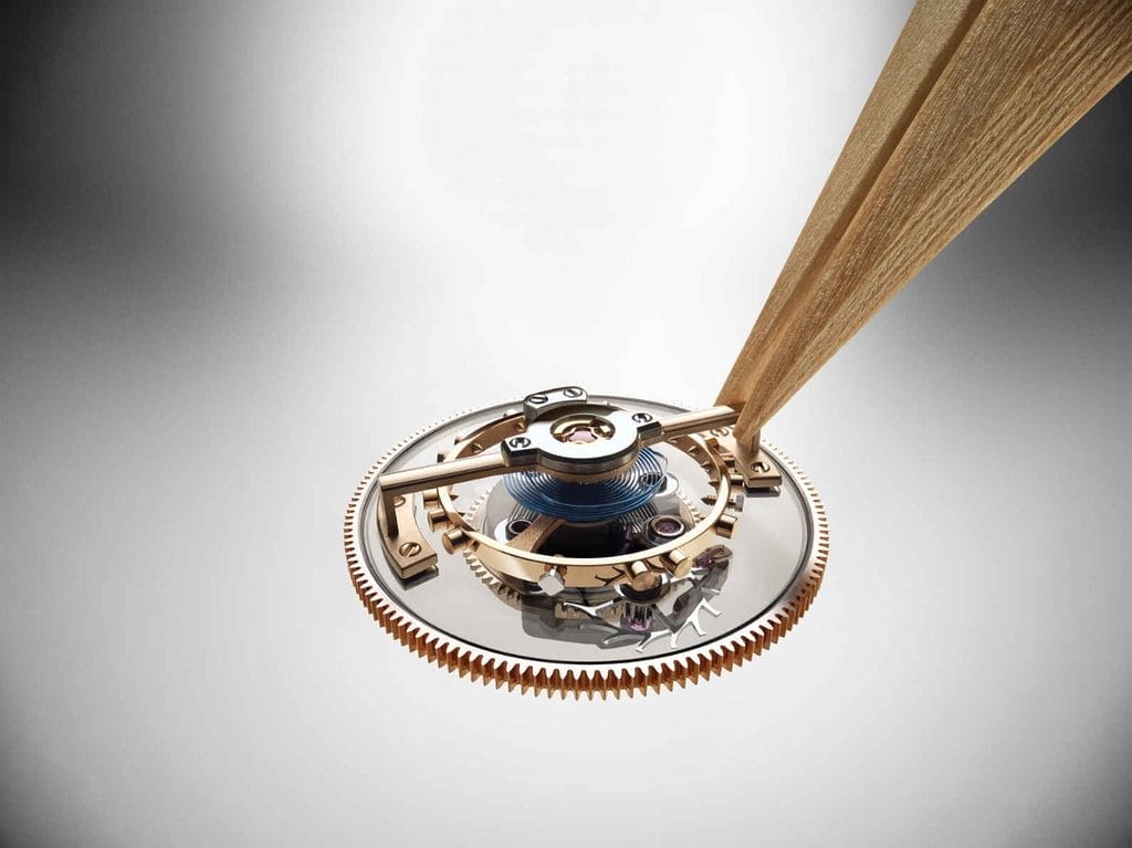 Le tourbillon semble flotter dans le vide : un exploit rendu possible par l’usage de ponts en saphir traités antireflet, rendant invisibles les structures qui le soutiennent. L’entraînement est dissimulé, créant une illusion de lévitation parfaitement maîtrisée.