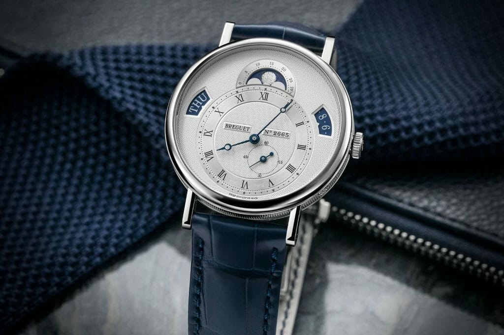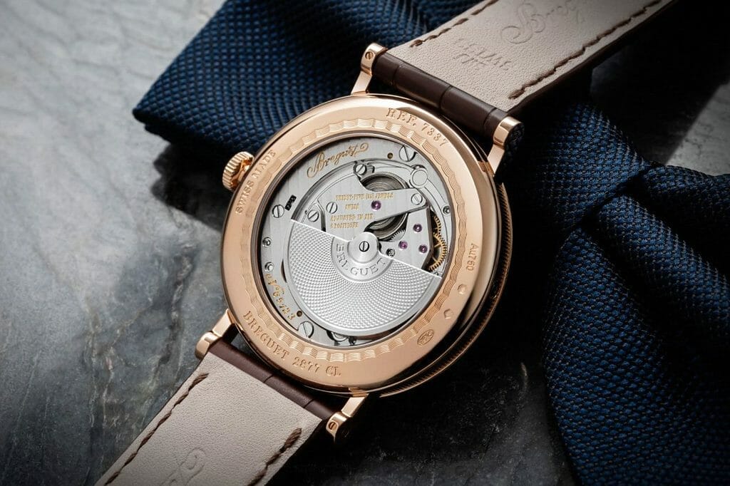 Ce dernier, à admirer par le fond saphir du boîtier, met en lumière un savoir-faire cher à Breguet : la décoration. Alors que la masse oscillante en or blanc est guillochée à la main du motif grain d’orge de forme circulaire, les autres composants affichent des finitions anglées ainsi que des Côtes de Genève. Finalement, le balancier du nouveau modèle Classique Calendrier 7337 oscille à une fréquence de 3 Hz, et sa réserve de marche affiche 45 heures.