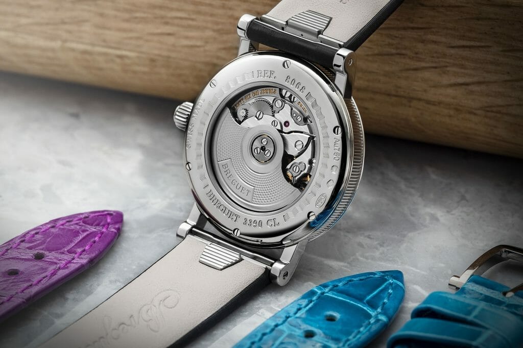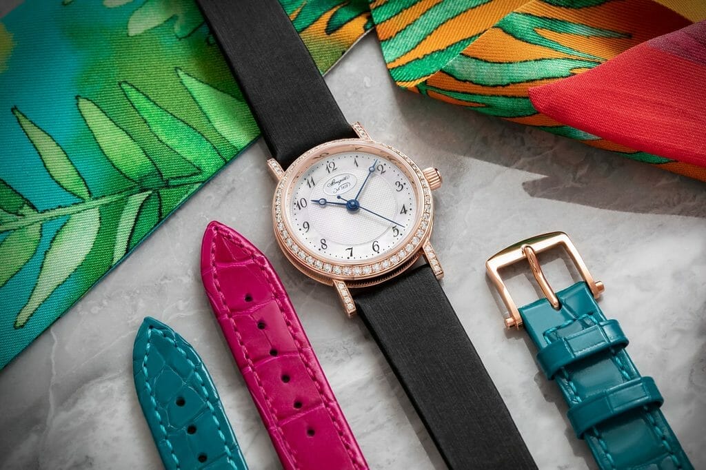 Désormais, il sera aussi facile de changer le style de sa montre Classique 8068 que de chausser d’autres escarpins. En effet, pour la première fois au sein des collections Breguet, la marque propose trois bracelets interchangeables logés dans un même coffret. Le système d’interchangeabilité rapide a été pensé pour pouvoir aisément et de manière autonome passer d’un bracelet à un autre sans avoir recours à des outils. En effet, par simple pression du poussoir situé sous le bracelet, l’utilisatrice peut le soulever pour l’enlever et le remplacer par un des deux autres bracelets, fournis chacun avec une boucle en or. Il suffit de positionner la fente situé sur l’extrémité supérieure de celui-ci au niveau de l’entre-corne de la montre, en position 45-60 degrès. Un clic permettra de sécuriser sa fixation. Quelques secondes permettent de passer d’un bracelet en tissu satiné noir à un bracelet coloré en alligator : pour la version en or blanc, les cuirs sont bleu sarcelle et violet byzantium. Pour les montres en or rose, ils sont couleur bleu paon et framboise.