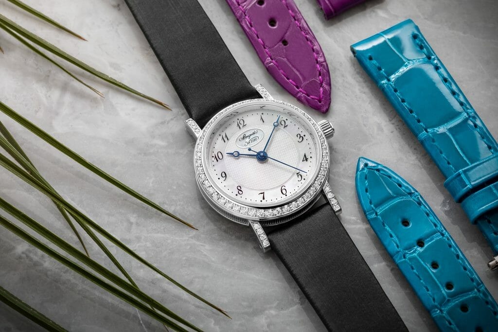 Au-delà des différents styles possibles grâce à ces bracelets, le cadran de la nouvelle Classique Dame 8068 affiche également une nouvelle allure mêlant modernité et raffinement. La couronne, initialement proposée avec un saphir bleu, est désormais munie d’un diamant cabochon. La boîte de 30 mm rêvet une lunette ainsi que des attaches serties de 64 diamants taille brillant. Le cadran en nacre est orné d’un guillochage d’une grande finesse réalisé à la main par les artisans de la manufacture. Pour apporter de la légéreté visuelle, les chiffres arabes signés Breguet composent à présent le tour d’heures. Enfin, un subtil cartouche ovale renferme le logo de la marque, situé à 12 heures.