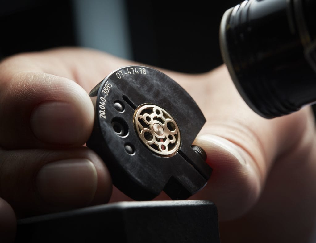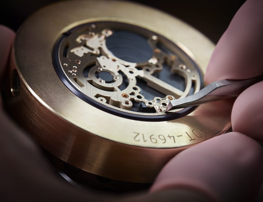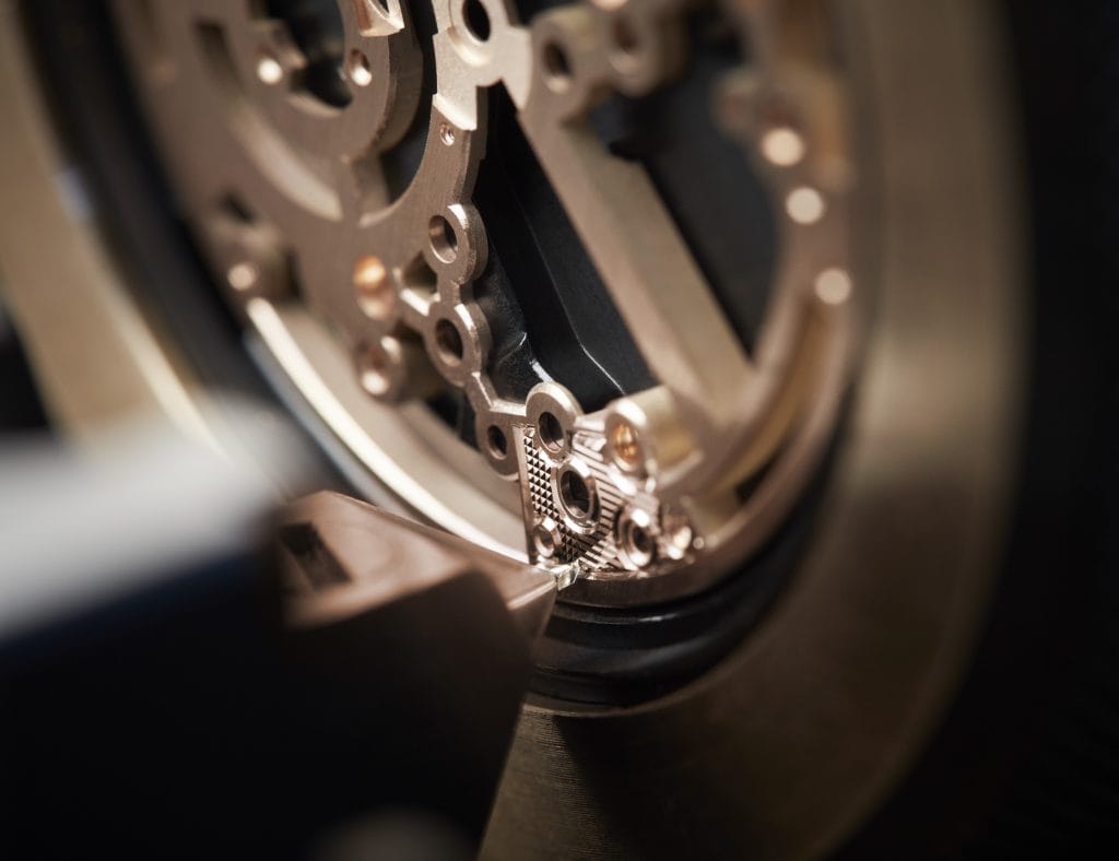 Très léger – l’ensemble de la cage ne pèse que 0,290 gramme –, doté d’une réserve de marche exceptionnelle de 80 heures grâce à un barillet à « haute énergie » battant à 4Hz – une fréquence particulièrement élevée pour un tourbillon –, ce Calibre 581 a déjà équipé les références 5377 et 5367. Pour la première fois, il se présente aujourd’hui entièrement squeletté, offrant une interprétation contemporaine de cette technique ancestrale. La platine et les ponts en or sont ainsi évidés, de manière à dévoiler l’anatomie mécanique du mouvement. Toute la difficulté de l’entreprise consiste à enlever le plus de matière possible, tout en conservant les propriétés techniques des différents composants. Une véritable complication horlogère supplémentaire, rendue plus périlleuse encore par le choix de l’or. L’alliage choisi ayant été durci, il nécessite un savoir-faire et un soin extrêmement pointus, qui seuls garantissent le résultat final. Breguet est l’une des dernières maisons à travailler l’or à ce niveau de performance.