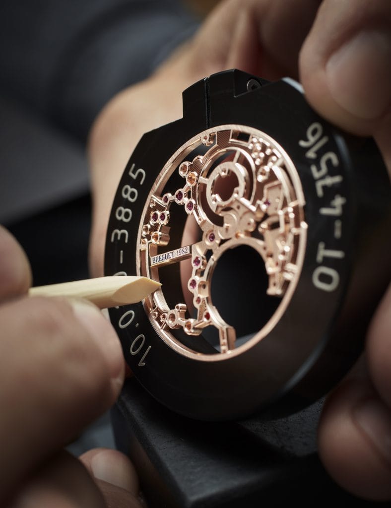Sa singularité, le mouvement la puise cependant dans ses finitions et ses décorations hors normes. A commencer par le guillochage des rares surfaces restantes de la platine. Le motif « clou de Paris » est ici réalisé au diamant, une méthode qui confère une brillance particulière à l’ouvrage, mais qui ne supporte aucune imprécision. Une telle intervention sur ce type de pièce constitue une première chez Breguet. Les arêtes vives, quant à elles, sont patiemment anglées à la lime, jusqu’à obtenir un biseau à 45° parfaitement lisse et régulier. Un important travail de gravure est enfin effectué à la main pour les différentes inscriptions, ainsi que les filets cintrant les trous.