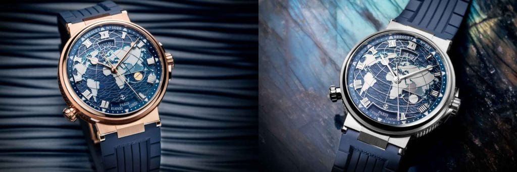 Le cadran offre une interprétation fascinante du monde au poignet en jouant sur les matières et sur la superposition des différentes plaques. Sur la première base en or, des vagues guillochées à la main s’échouent sur les rivages des continents. Le fond soleillé du cadran, habillé d’un bleu abyssal, donne aux vagues une sensation de valses permanentes. Mais peut-être est-ce aussi dû aux traitements des continents…Une plaque additionnelle faite de saphir est composée des méridiens métallisés. Les continents bénéficient d’un traitement satiné horizontal et leurs littoraux sont subtilement dessinés d’un liseré turquoise métallisé. Enfin, un rehaut extérieur maintient les différents éléments présents sur le cadran. Un résultat aux dimensions et surfaces parfaitement exécutées grâce à différents traitements ayant nécessité plusieurs semaines de travail.