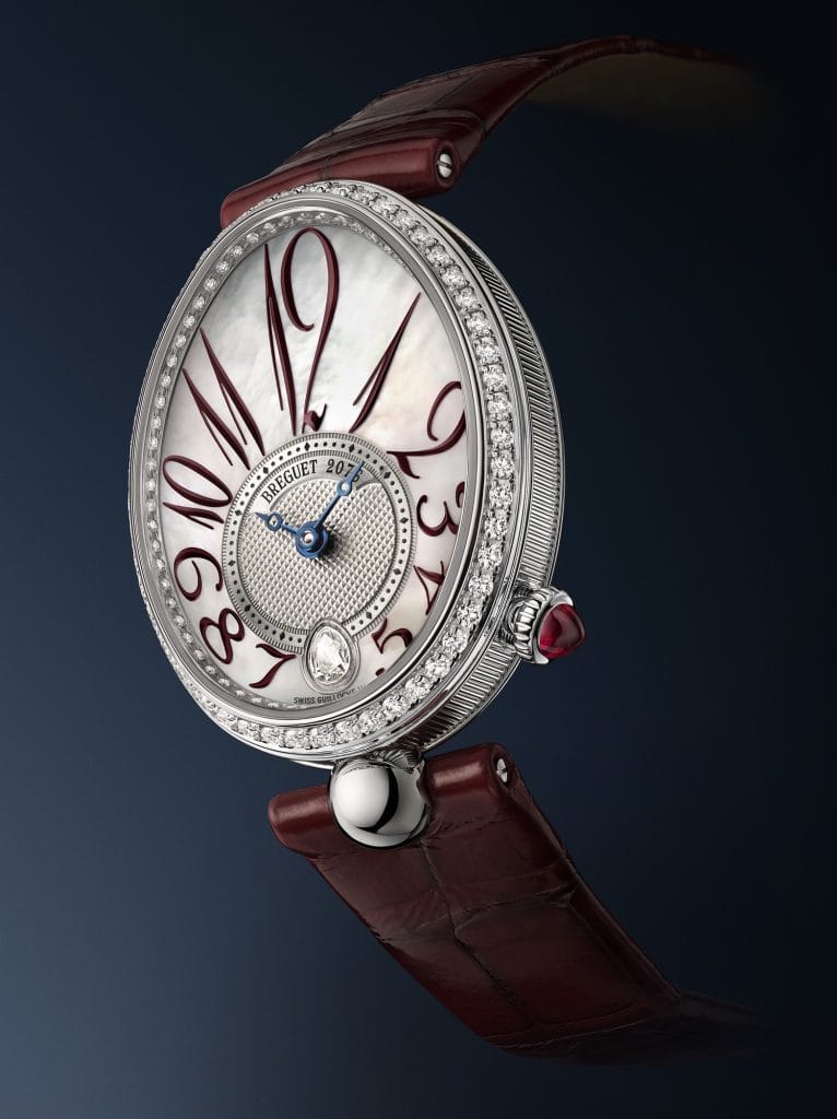 La Maison Breguet avive la Reine de Naples 8918 de touches de pourpre. De la nacre opaline ainsi que des diamants illuminent cette composition en or blanc.