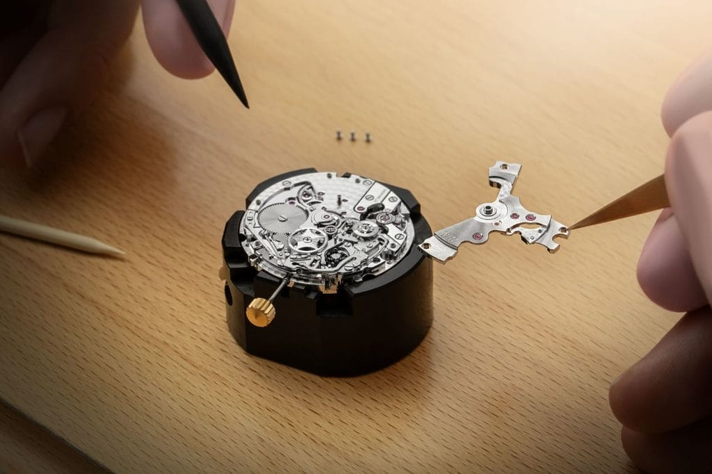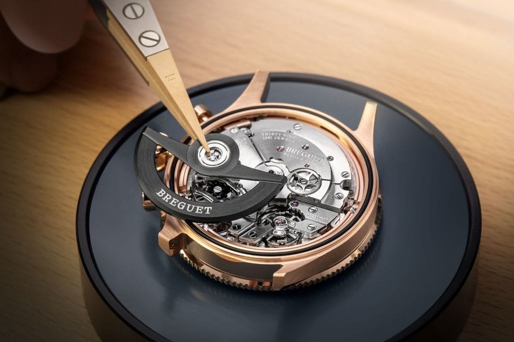 Sorti en 2023 après 4 ans de développement, le mouvement 728 a été imaginé, développé et finalisé au sein de la Manufacture Breguet. Celui-ci est évidemment doté de la fonction « retour en vol », appelée également « flyback ». Avant sa création, trois manipulations étaient nécessaires au lieu d’une seule. Innovants, les systèmes de déclenchement et de remise à zéro du nouveau calibre ont été étudiés afin que leur utilisation soit nette et précise. Quelle que soit la fonction utilisée, la pression exercée sur les poussoirs est régulière et équilibrée. Quant à son mécanisme d’embrayage vertical, il a été choisi pour sa précision au déclenchement. Ainsi, l’aiguille de chronographe démarre immédiatement sans sauts au départ. Afin d’assurer la solidité du mouvement et de garantir sa précision lors d’éventuels chocs, le choix de la maison s’est porté sur un pont traversant, qui permet de maintenir le balancier.